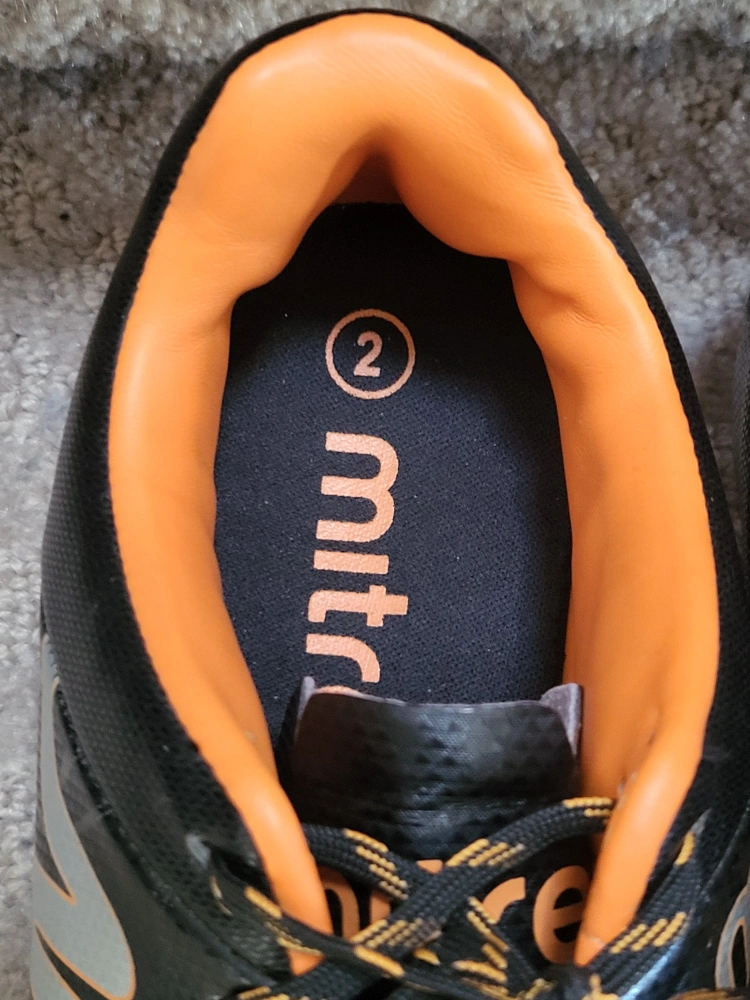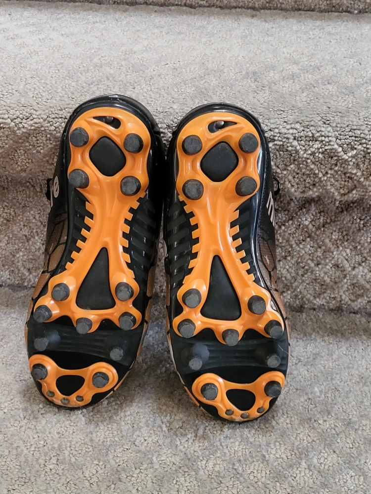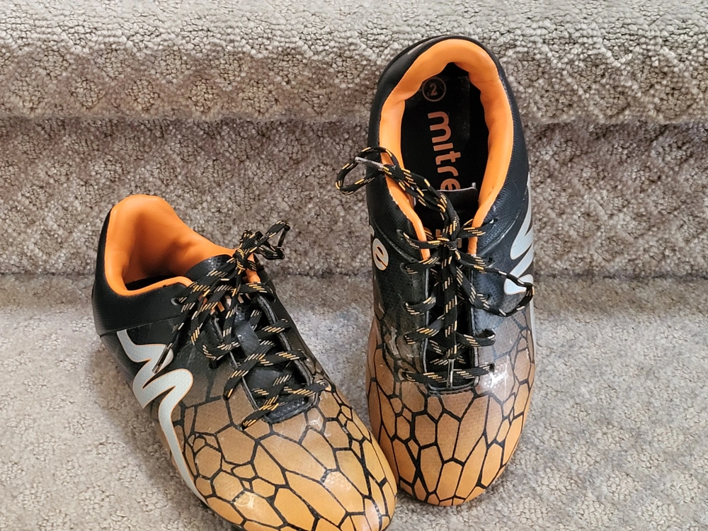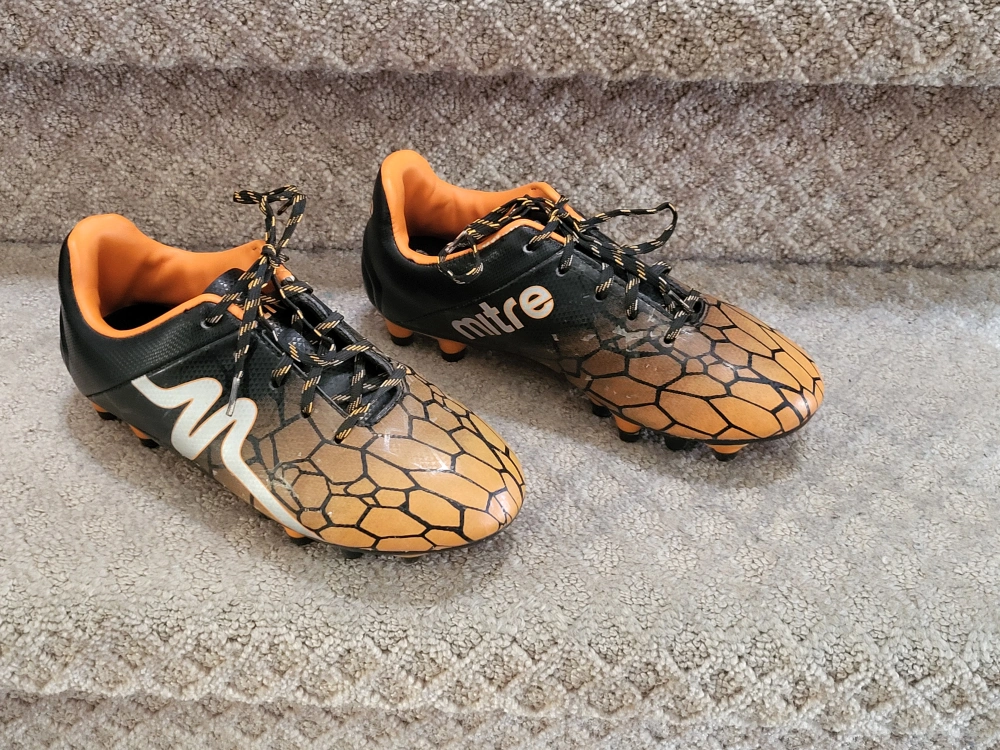 Selling a pair of Mitre soccer cleats in size 2. They are in good condition and ready for the field! The cleats feature a black and orange design.