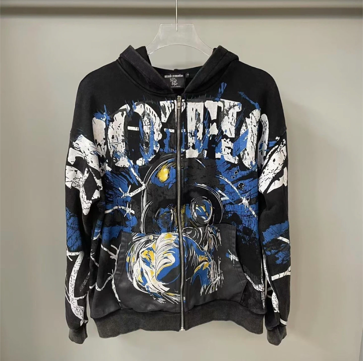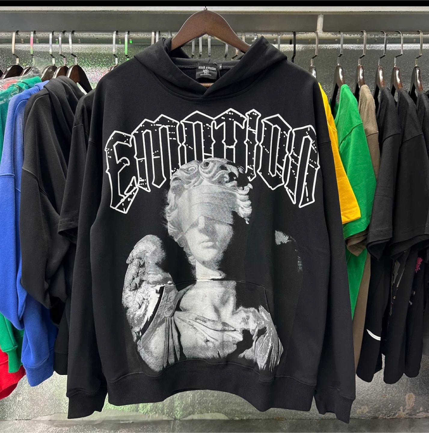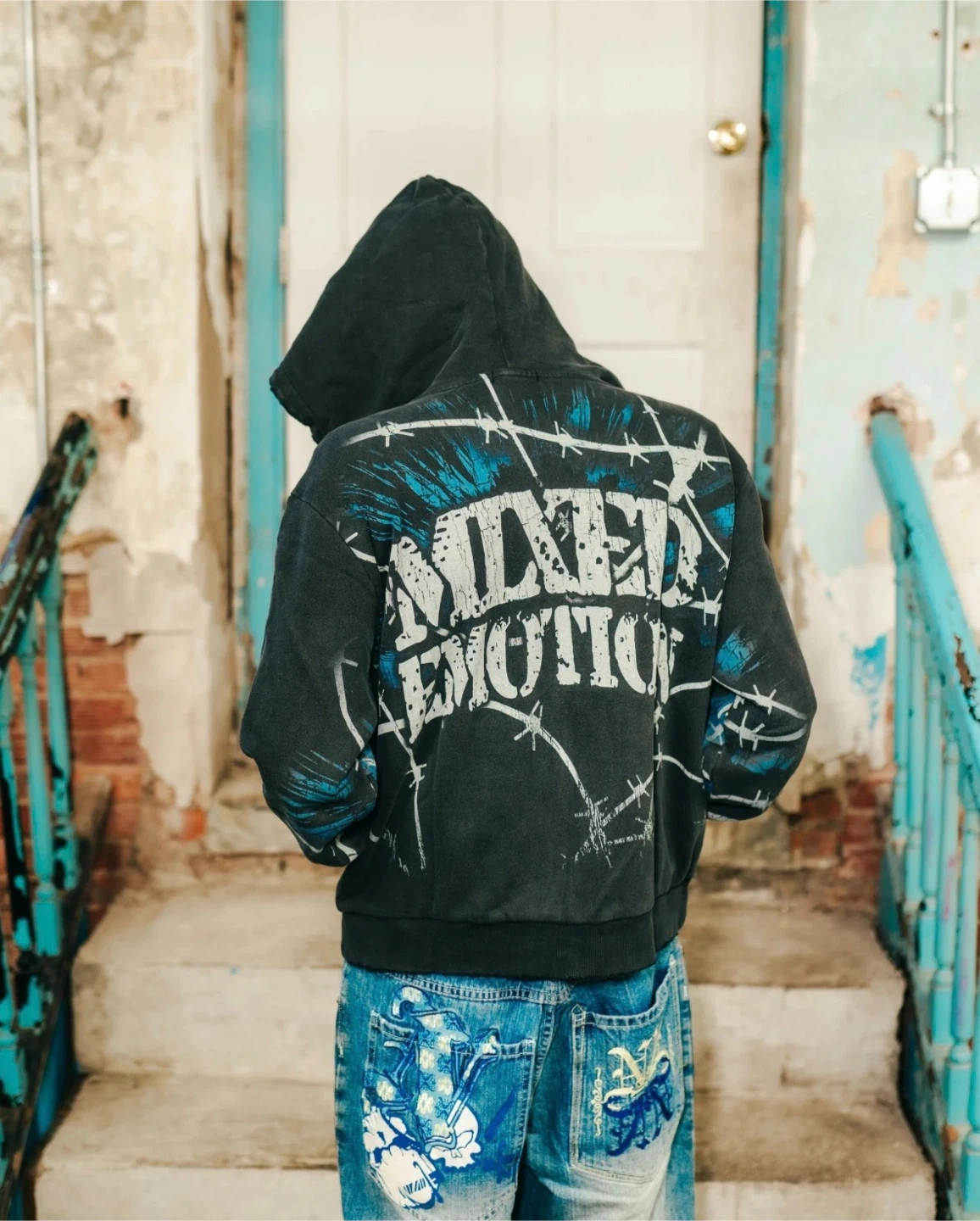 Selling a Mixed Emotion black hoodie with a cool graphic design! The hoodie features a unique print on the front and back, making it a standout piece for casual wear. It's in great condition and ready for a new home. Perfect for adding some edge to your wardrobe!