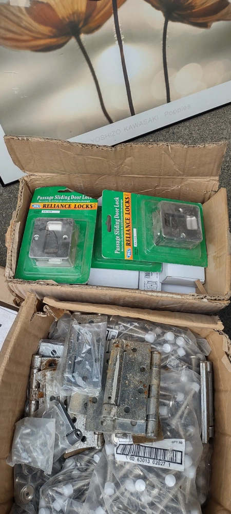 Selling a mixed lot of hardware items. Includes hinges, passage sliding door locks (Reliance Locks), dummy levers (Weiser), and light switch plates (Eaton). Great for DIY projects or renovations!