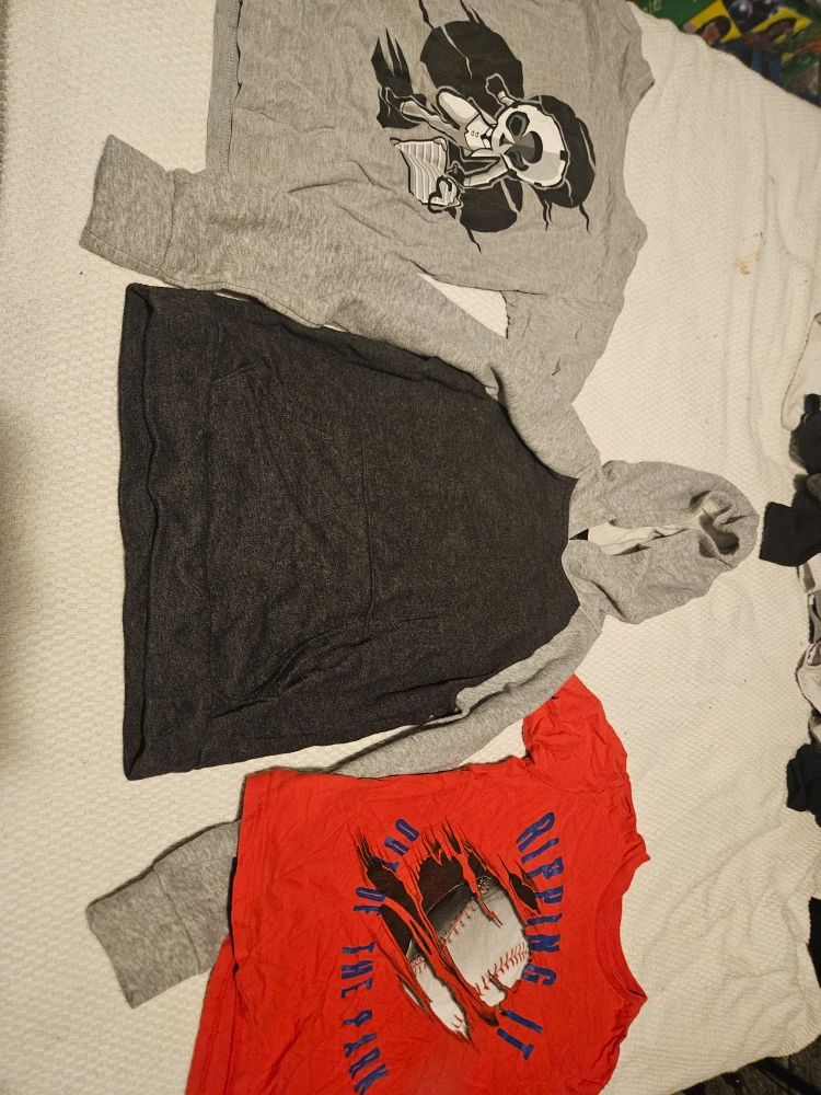 Selling a mixed lot of kids' shirts. There's a grey long-sleeve with a graphic, a dark grey hoodie, and a red baseball-themed tee. Great for everyday wear!