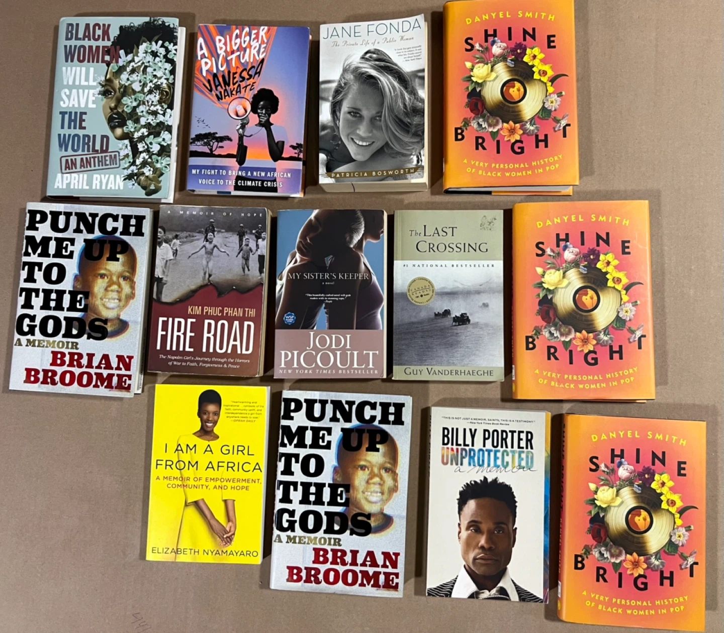Selling a collection of memoirs and biographies! Includes titles like: - Black Women Will Save the World by April Ryan - A Bigger Picture by Vanessa Nakate - Jane Fonda: The Private Life of a Public Woman by Patricia Bosworth - Shine Bright by Danyel Smith - Punch Me Up to the Gods by Brian Broome - Fire Road by Kim Phuc Phan Thi - My Sister's Keeper by Jodi Picoult - The Last Crossing by Guy Vanderhaeghe - I Am a Girl From Africa by Elizabeth Nyamayaro - Billy Porter: Unprotected