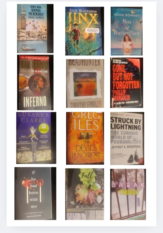 Selling a mixed lot of paperback books. Titles include: - The Fall Awakening by Margaret and Amy Myers - Jinx by Sage Blackwood - Thus Was Adonis Murdered by Sarah Caudwell - Box of Butterflies by Roma Downey - Inferno by Dan Brown - Headhunter by Timothy Findley - Gone But Not Forgotten by Phillip Margolin - Piranesi by Susanna Clarke - The Devil's Punchbowl by Greg Iles - Struck By Lightning by Jeffrey S. Rosenthal - If He Had Been With Me by Laura Nowlin - Break Through by WinterMargaret and Amy Myers