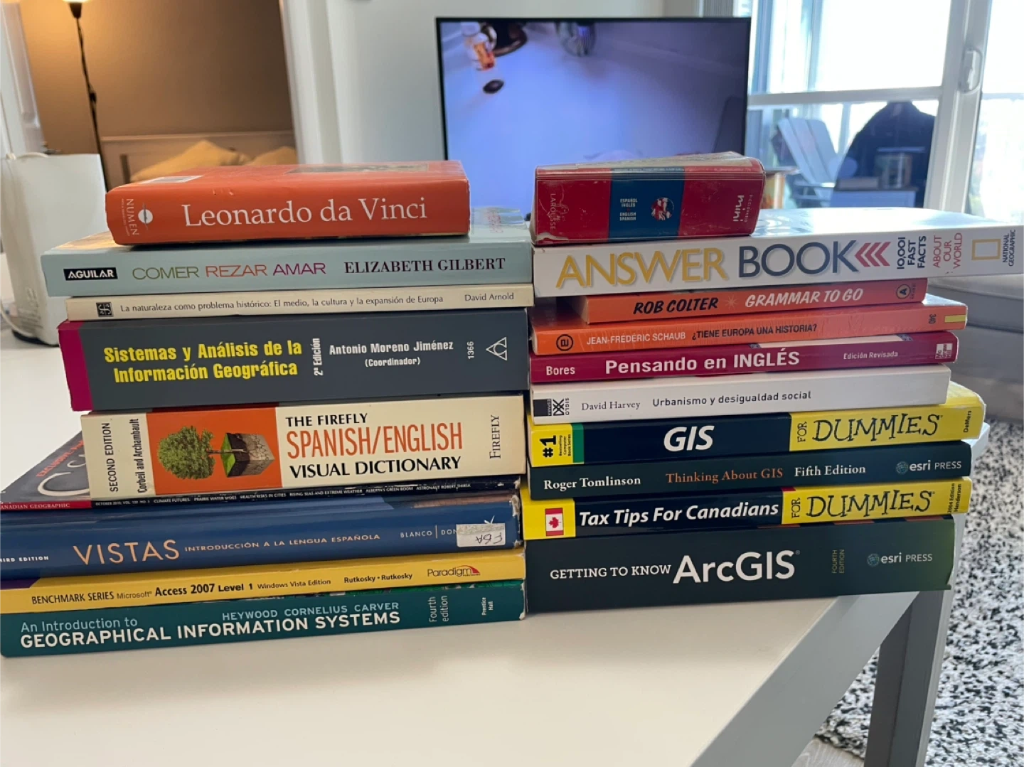 Selling a variety of textbooks and dictionaries, including: - Leonardo da Vinci $5 - Comer Rezar Amar by Elizabeth Gilbert $5 - Sistemas y Análisis de la Información Geográfica $20 - The Firefly Spanish/English Visual Dictionary $15 - Vistas Introducción a la Lengua Española $5 - Answer Book $5 - Grammar to Go by Rob Colter $3 - Pensando en Inglés $3 - GIS by Roger Tomlinson $20 - Tax Tips for Canadians for Dummies $5 - Getting to Know ArcGIS $20 - Microsoft Access 2007 Level 1 $3 -Larousse mini dictionary español-English $3 -David Harvey Urbanismo y Desigualdad social $5 -GIS for Dummies $5