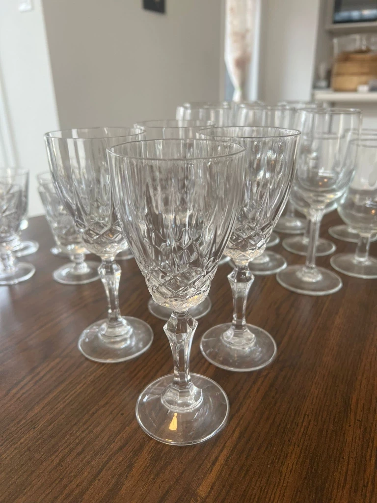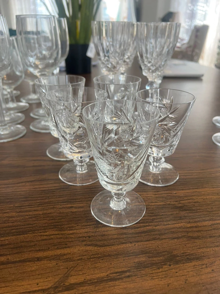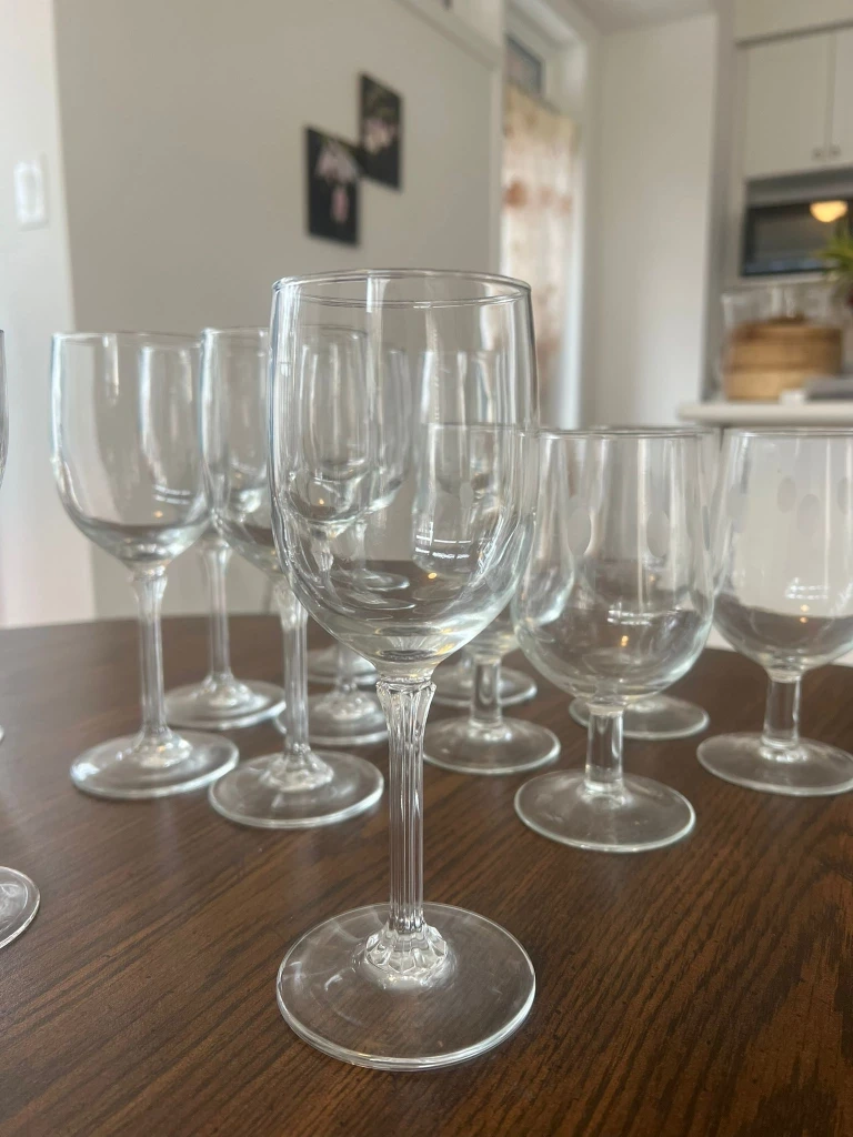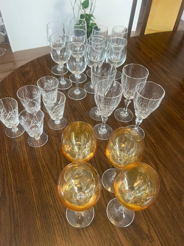 Selling a lovely mixed set of vintage wine glasses! There are several different styles, including clear crystal and amber-tinted glass. Perfect for adding a touch of elegance to your next dinner party or get-together