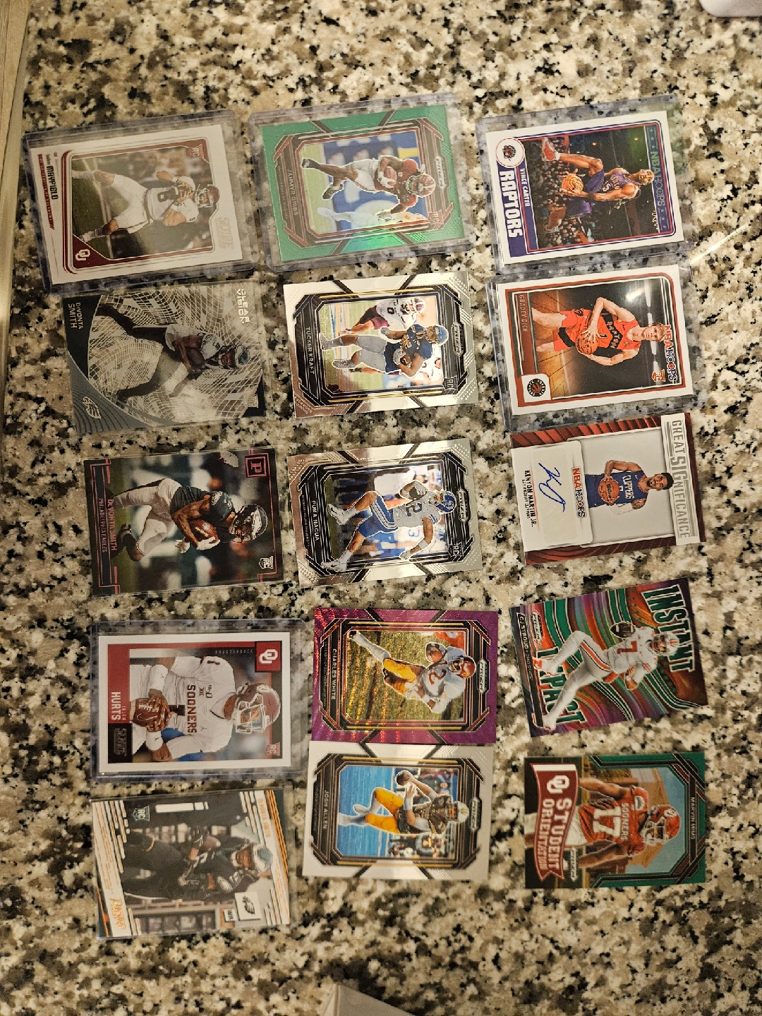 Selling a collection of mixed sports trading cards, including NBA Hoops and NFL cards. Featuring players like Vince Carter (Raptors), Kenyon Martin Jr. (Clippers), and Devonta Smith (Eagles), among others. Great for collectors!