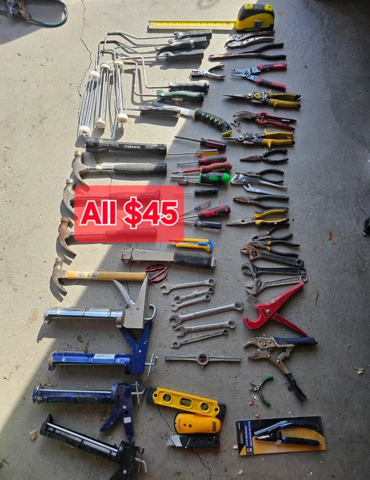 Selling a mixed lot of tools for $45. Includes hammers, wrenches, pliers, screwdrivers, caulking guns, and more! Great for someone starting out or looking to add to their collection