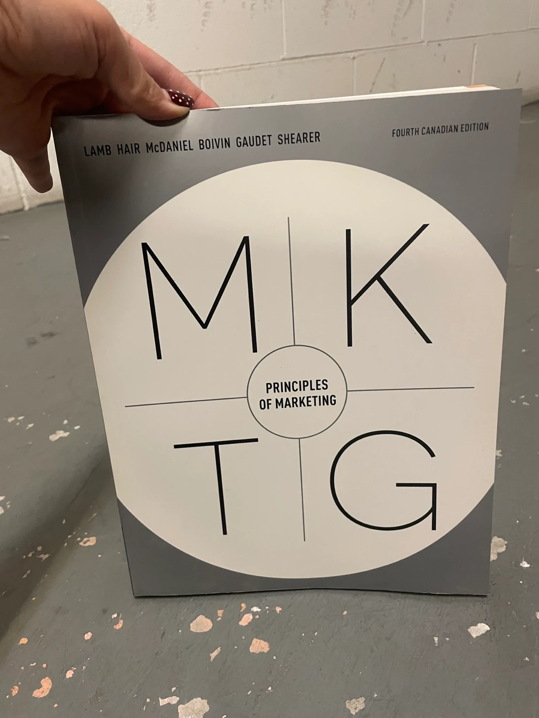 Selling a copy of MKTG Principles of Marketing, Fourth Canadian Edition by Lamb, Hair, McDaniel, Boivin, Gaudet, and Shearer! This textbook is in great condition and perfect for anyone taking a marketing course.
