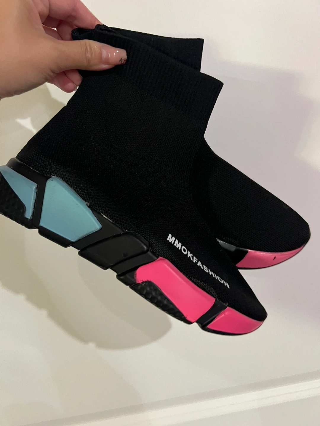 Selling a pair of black sock sneakers from MMOKFashion. They feature a unique design with pink and blue accents on the sole. Perfect for adding a stylish touch to your casual outfits!