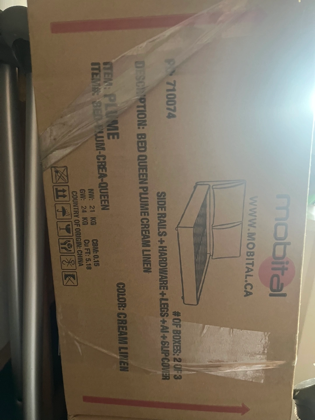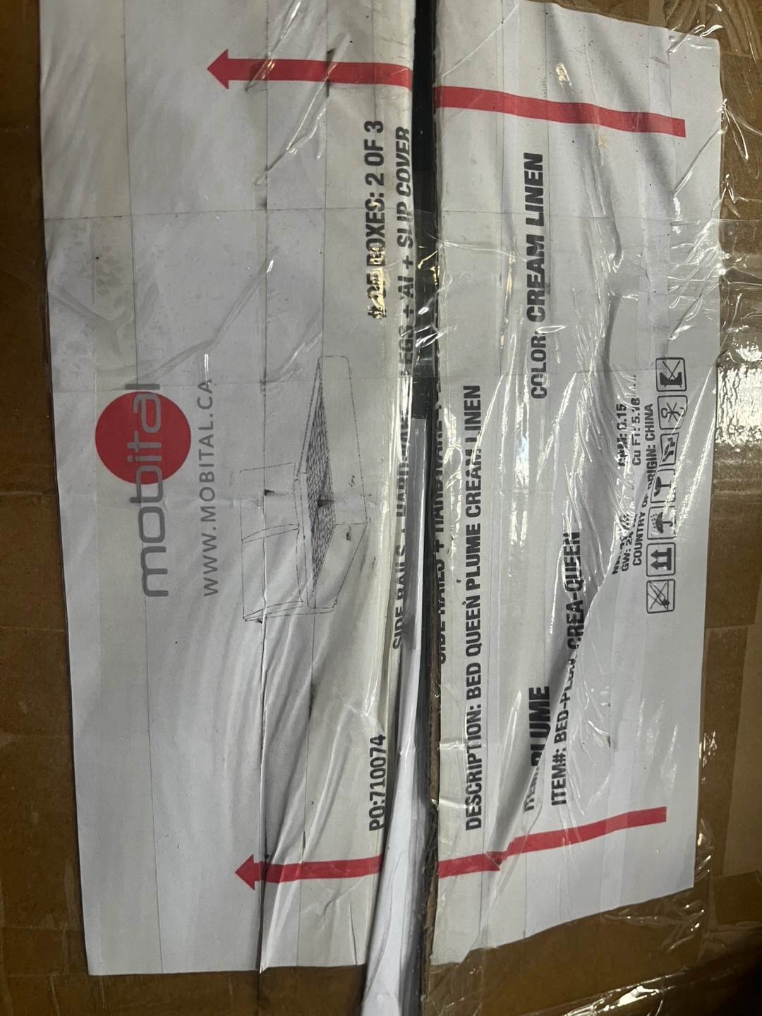Selling a Mobital Plume bed frame, queen size, in a cream linen colour. It comes with the side rails, hardware, legs and slip cover. The item is BED-PLUME-CREA-QUEEN. No headboard. In box never been removed and should have all hardware pieces. Purchased at warehouse sale, but changed our mind for king.