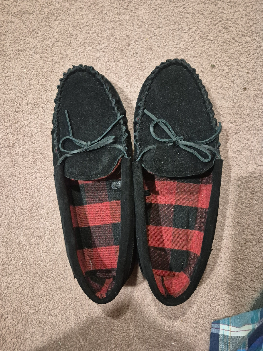 Moccasin Slippers - Black with Buffalo Plaid