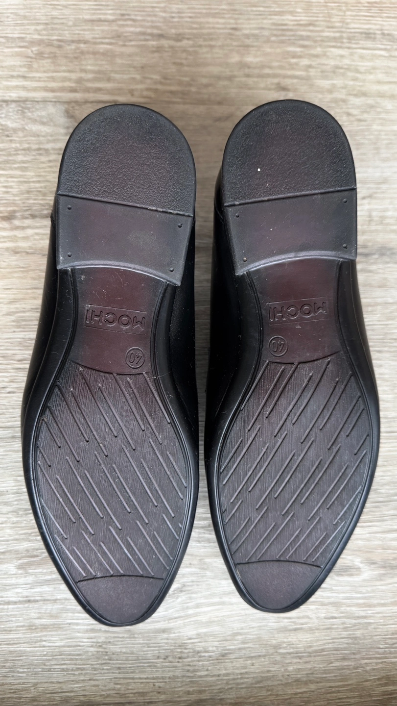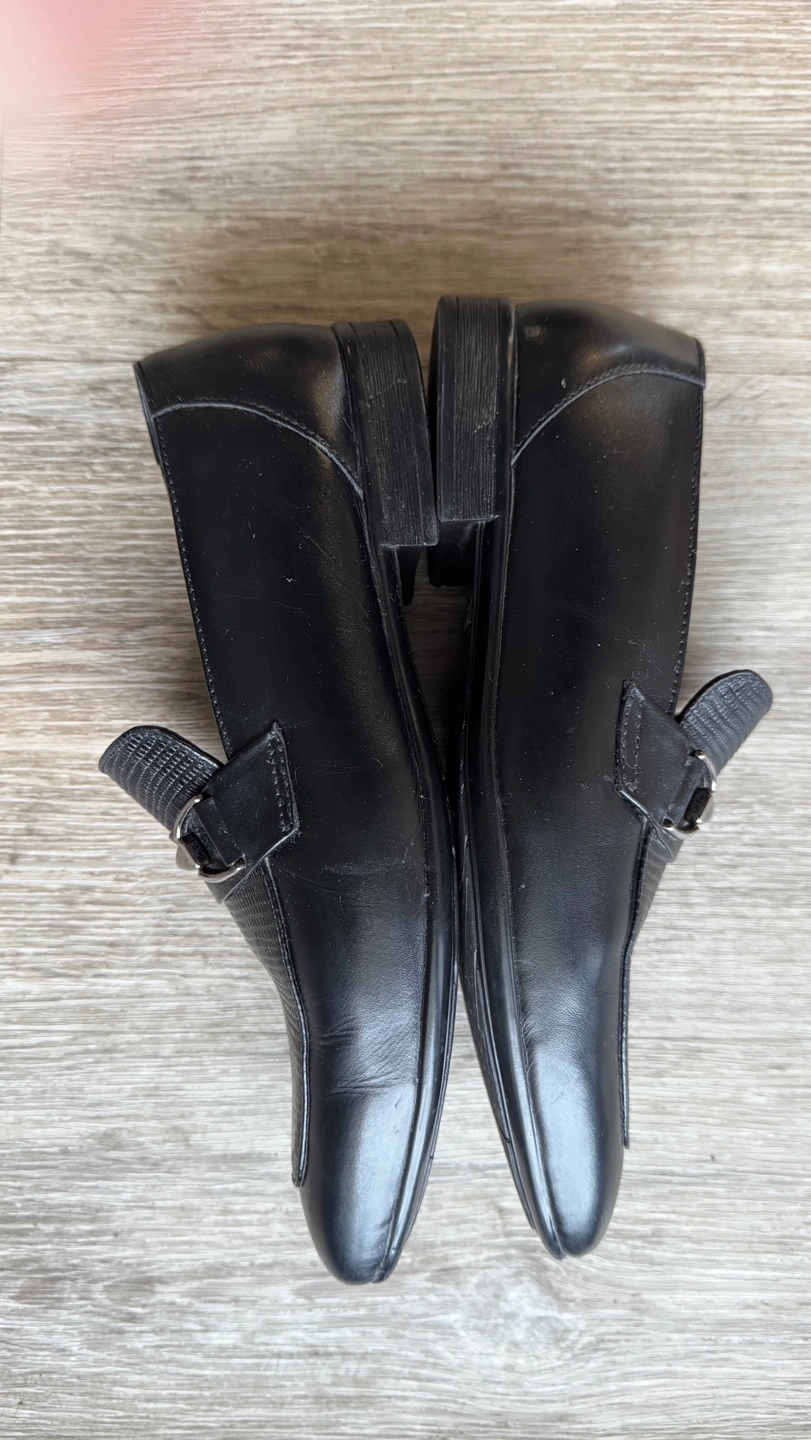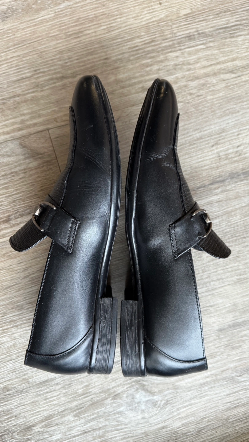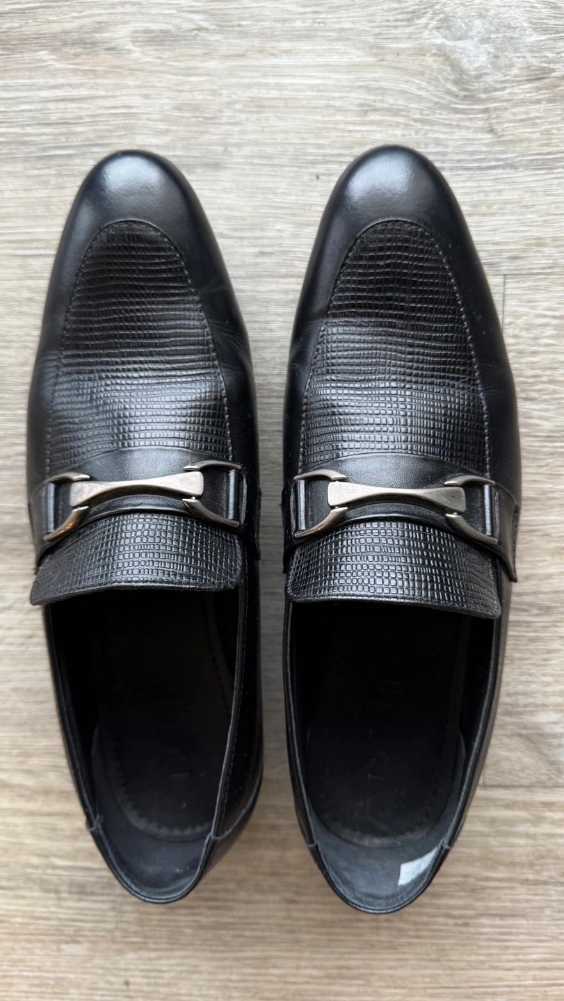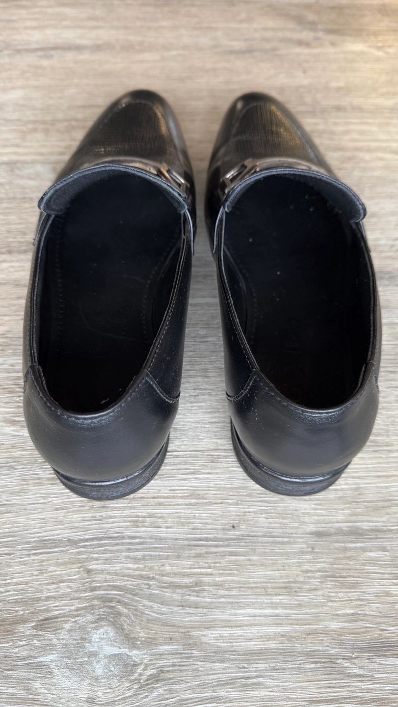 Black leather loafers shoe with silver buckle accents. They are used for 2-3 times only. Pet free smoke free bug free home. Pickups only. Please check my other listing as well.