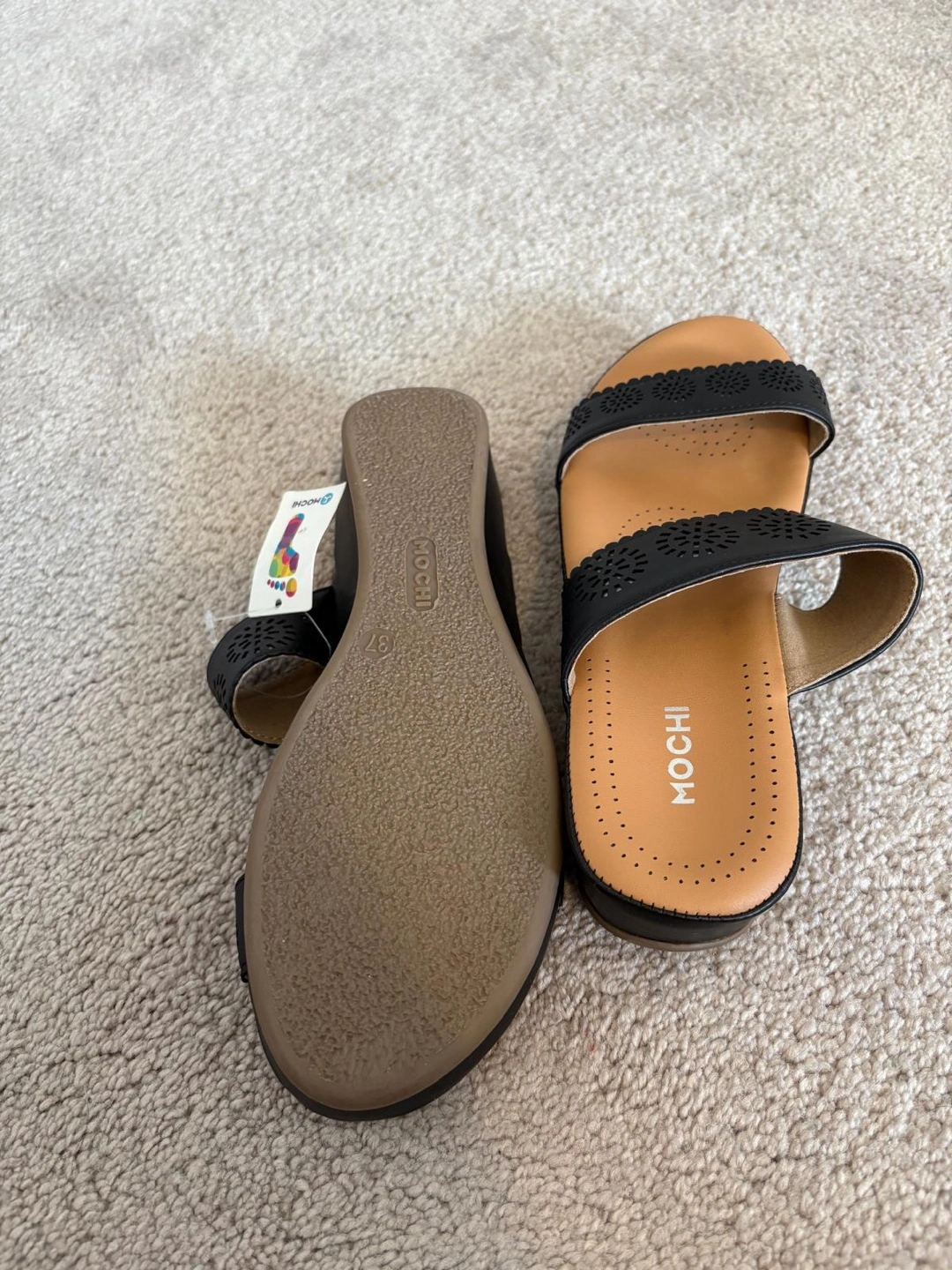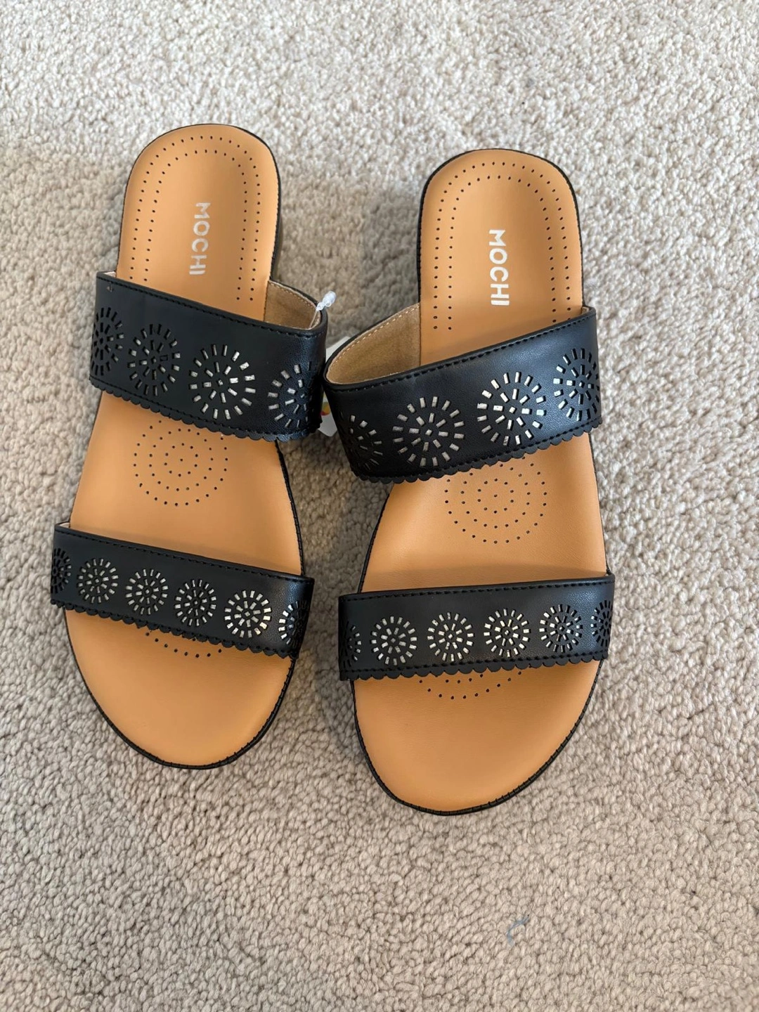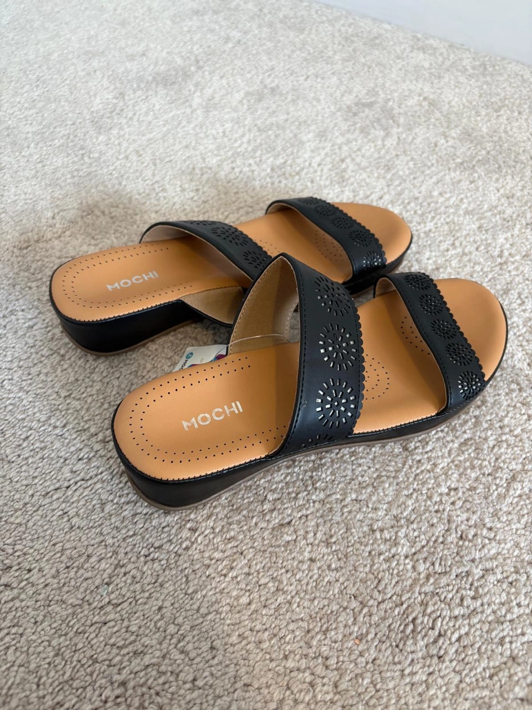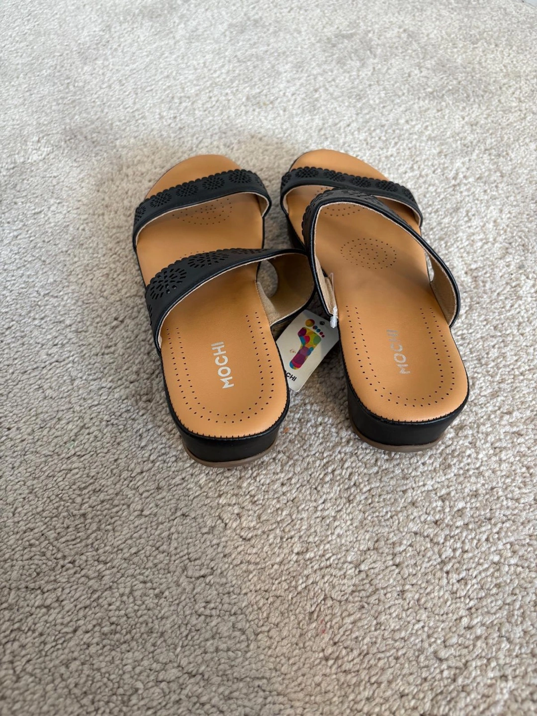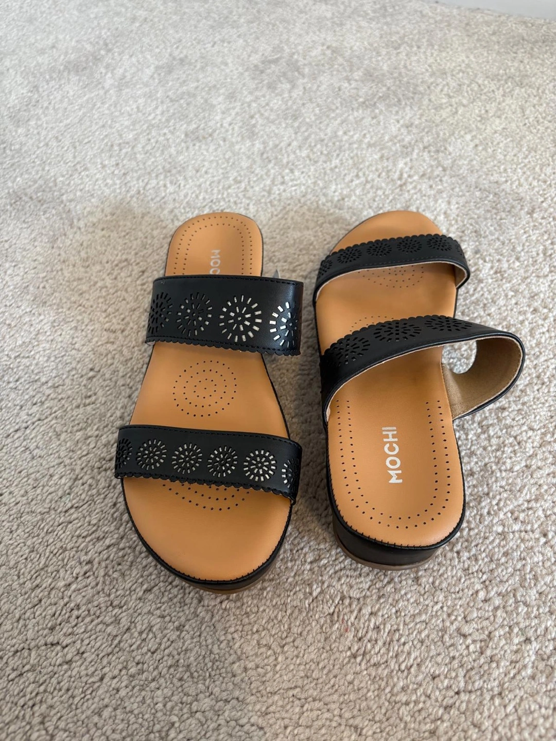 Cute pair of Mochi sandals in black! They are a size 37. The sandals feature a double strap design with decorative cutouts. Perfect for adding a touch of style to your summer outfits!