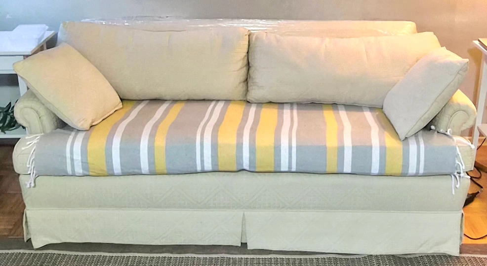 Selling a stylish and comfortable 3-seater sofa/couch in excellent condition. It’s very new, clean, and well-maintained with no damage or stains. The neutral beige tone with striped throw cover makes it versatile and easy to match with any décor. ✔️ Hardly used, looks like new ✔️ Sturdy frame & comfy cushions ✔️ Neutral design fits any living room ✔️ Comes from a smoke-free, pet-free home Only selling because I need a sofa bed due to space requirements. 📍 Pickup from North York