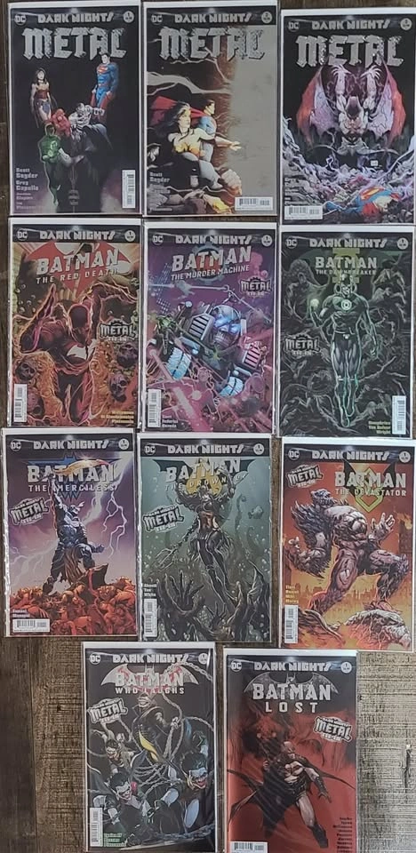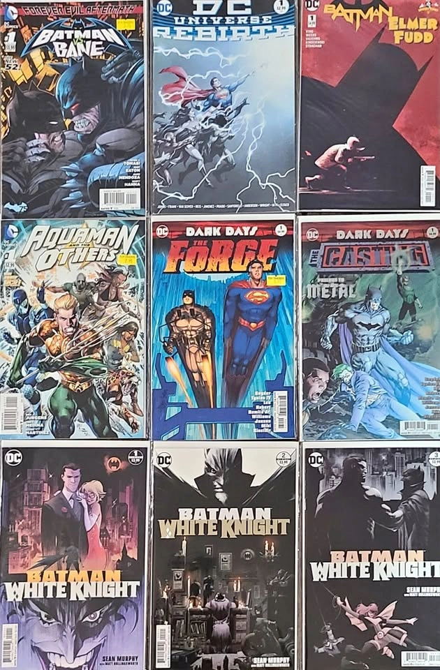 Selling a collection of DC Comics (mostly Batman) in a bundle. Great value! All books are in bags with boards and in new condition. The bundle includes the following issues: Batman/Elmer Fudd (one-shot) Batman White Knight #1-3 DC Universe Rebirth (one-shot) Batman vs. Bane (one-shot) Aquaman and the Others #1 Batman: Europa #1-4 (complete) Batman '66 meets the Man from U.N.C.L.E. #1-6 (complete) Batman '66 meets Steed and Mrs. Peel #1 Batman/TMNT crossover #1-6 (complete) Batman/TMNT II crossover #1 Dark Knights Metal Event Books: Dark Knights: Metal #1-3 Dark Days: The Forge Dark Days: The Casting Batman: Lost Batman: Red Death Batman: The Murder Machine Batman: The Dawnbreaker Batman: The Merciless Batman: The Drowned Batman: The Devastator Batman: Who Laughs. Open to offers, pickup is in Langley. I am selling a few other series as well, so check my profile if you are interested.