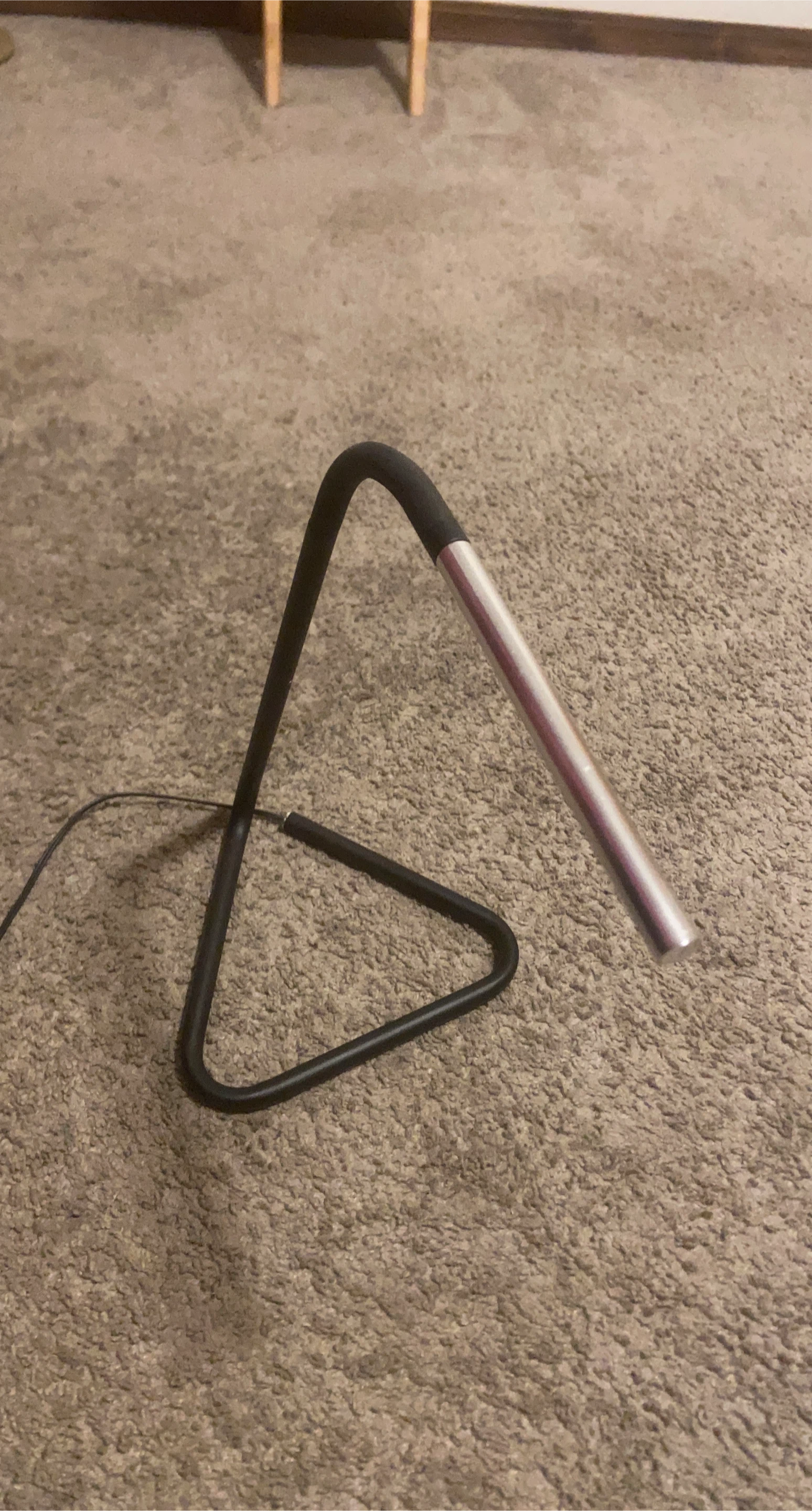 Selling a modern desk lamp with a sleek design. It features a black triangular base and a silver cylindrical light. Great for adding a touch of style to your workspace