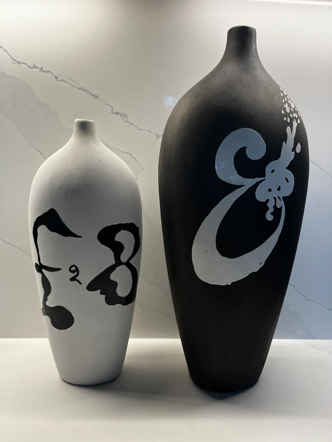 Add a touch of modern art to your home with this set of two vases! One is a sleek black with a white design, and the other is white with a black design. They're perfect for displaying your favourite flowers or as standalone decorative pieces
