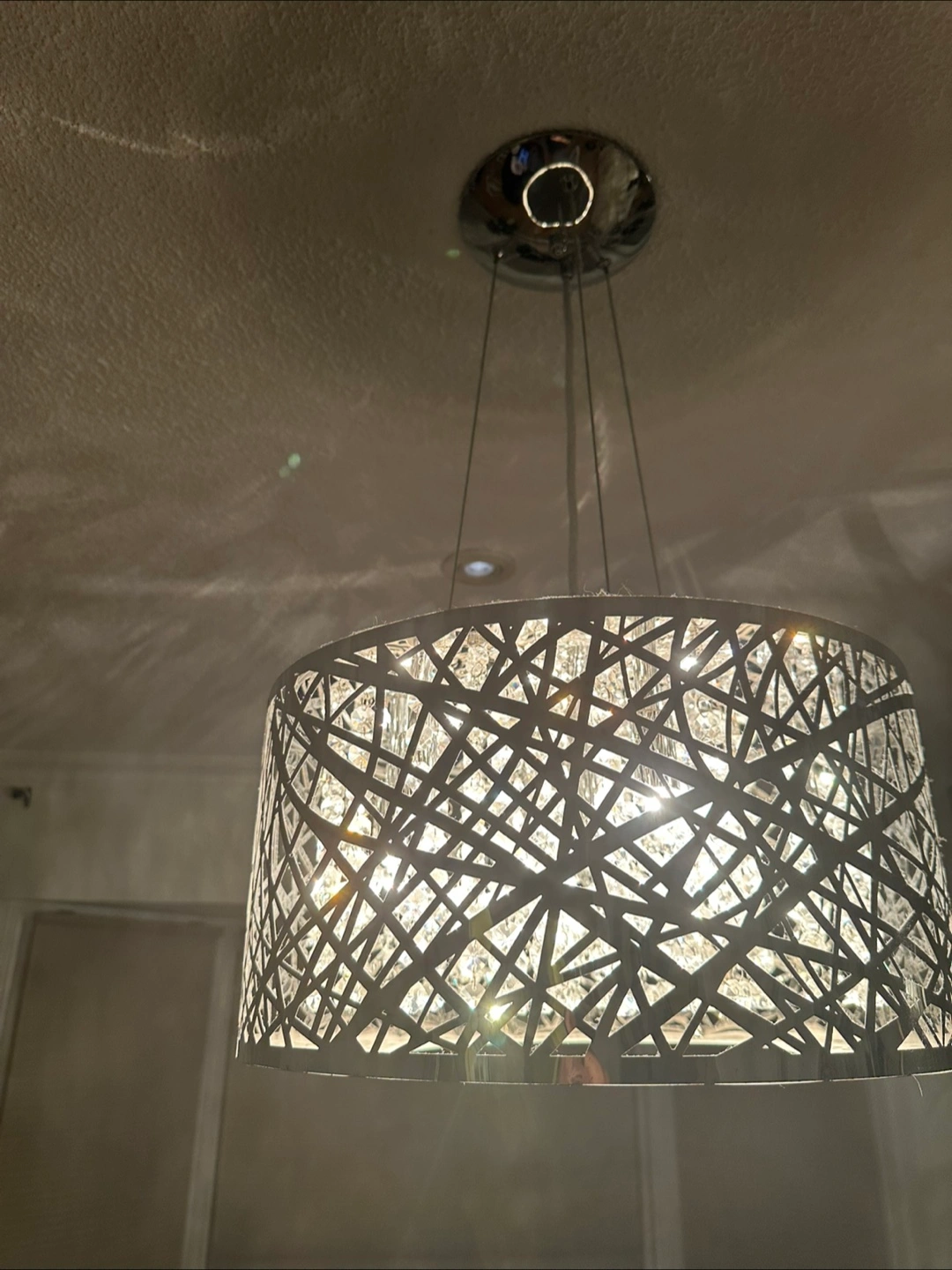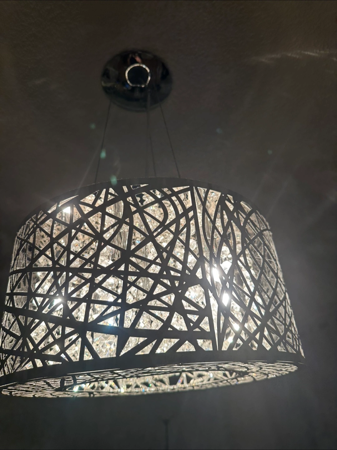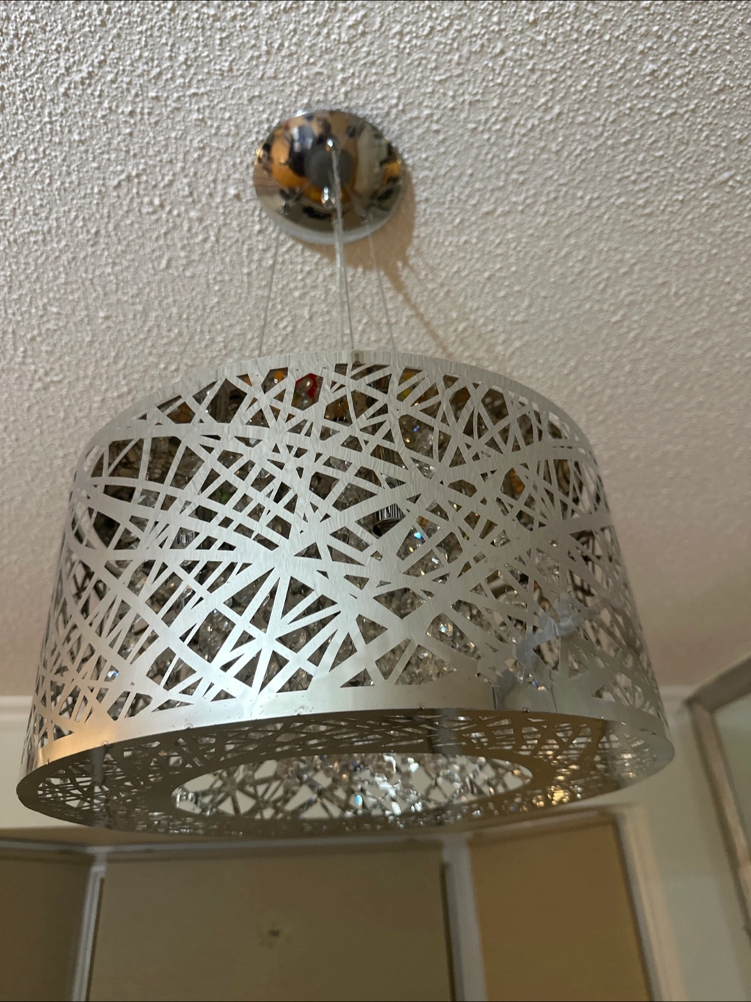 A pendant light fixture. Features a metal shade, cut with a modern design. Includes hanging crystals within the shade. It would make a beautiful addition to a dining room or living space, creating a tranquil atmosphere. Some lightbulbs need replacing