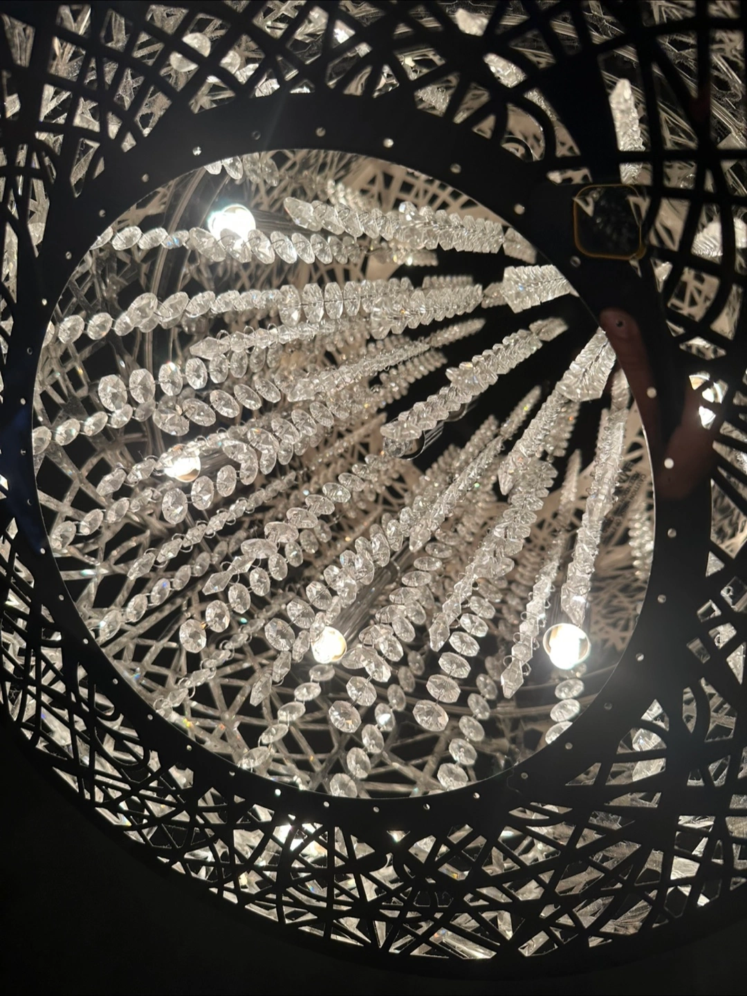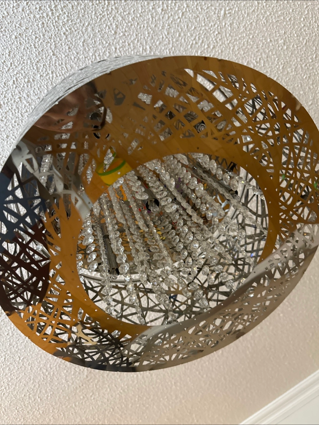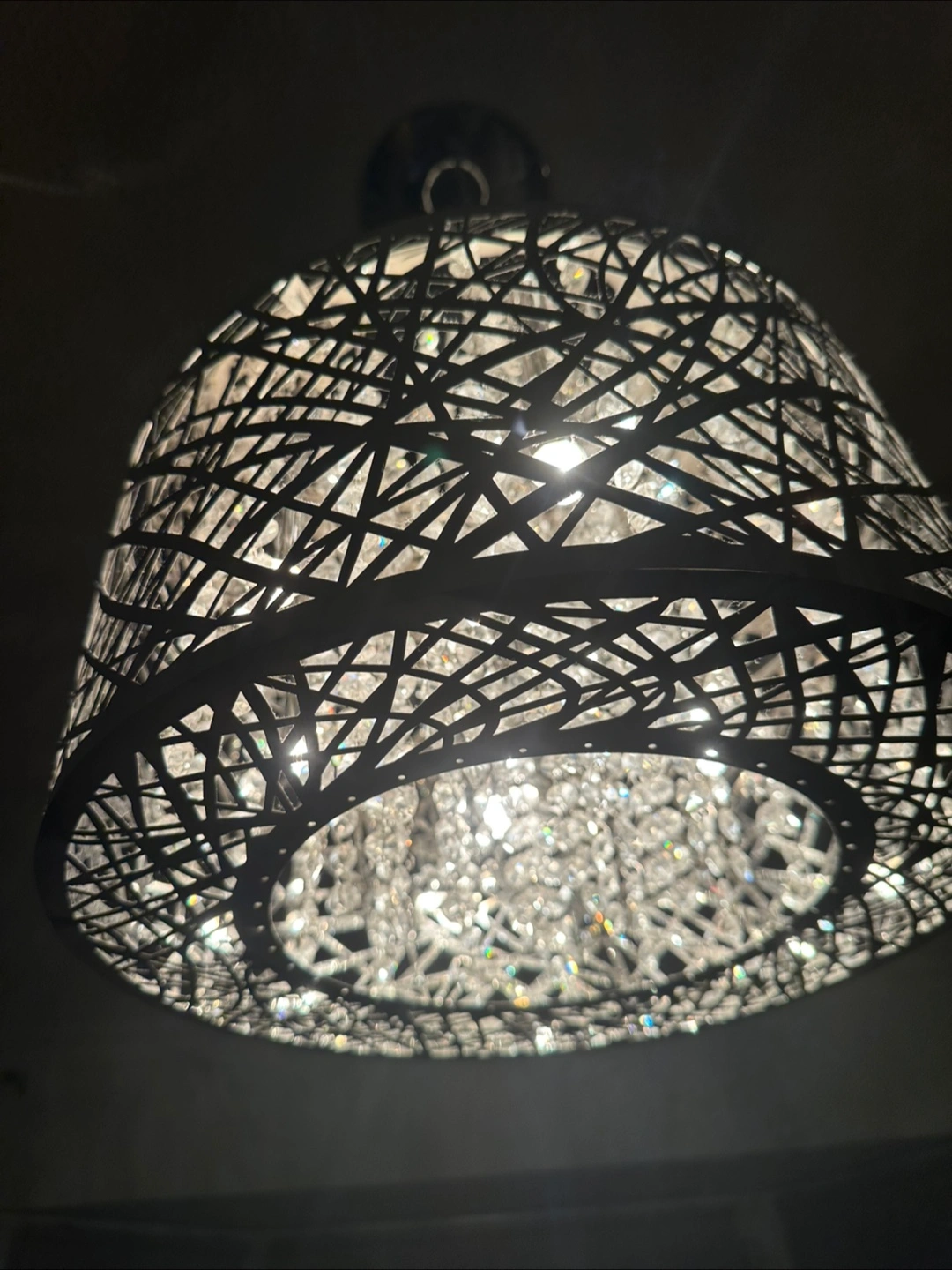 A pendant light fixture. Features a metal shade, cut with a modern design. Includes hanging crystals within the shade. It would make a beautiful addition to a dining room or living space, creating a tranquil atmosphere. Some lightbulbs need replacing