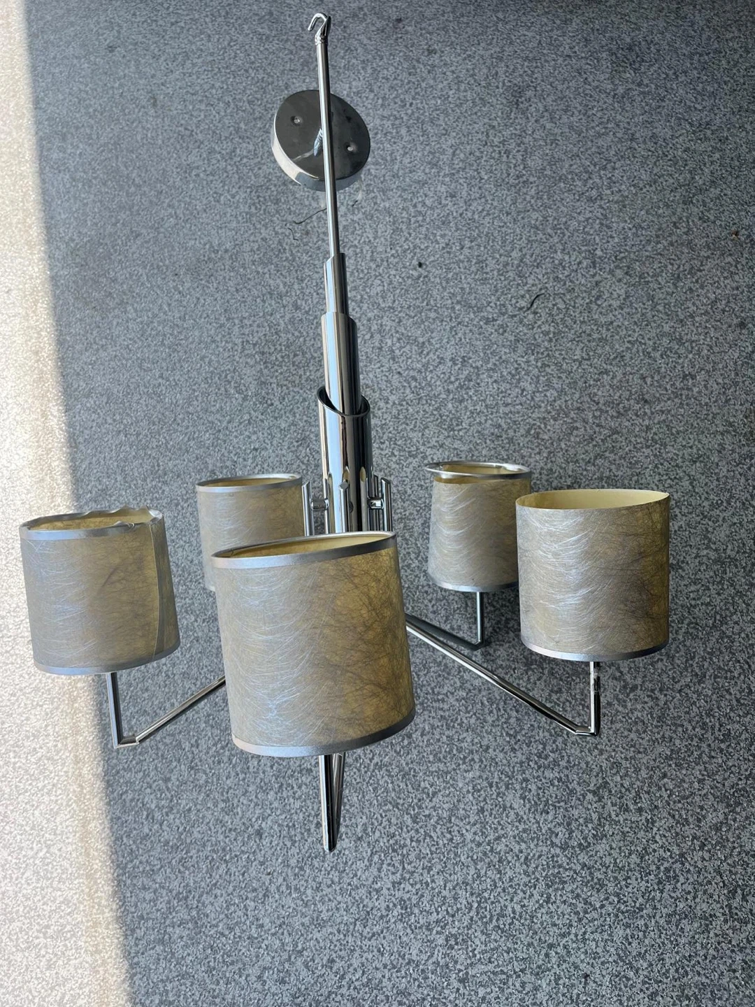 Add a touch of modern elegance to your space with this stylish chandelier! It features a sleek chrome finish and five beige lampshades, perfect for creating a warm and inviting ambiance. Great for a dining room or living room! The lampshades are damaged bit easily replaceable