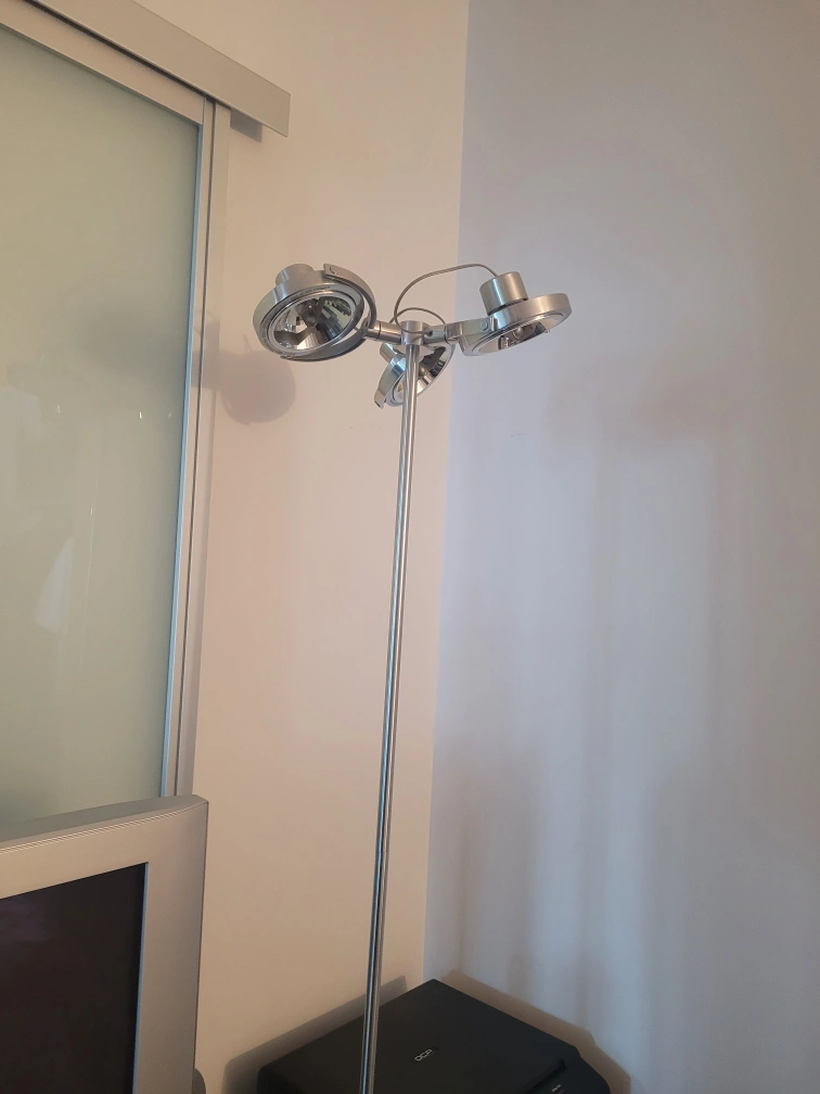 Sleek chrome finish. Three adjustable lights. Tall and stylish. Perfect for living room or office.