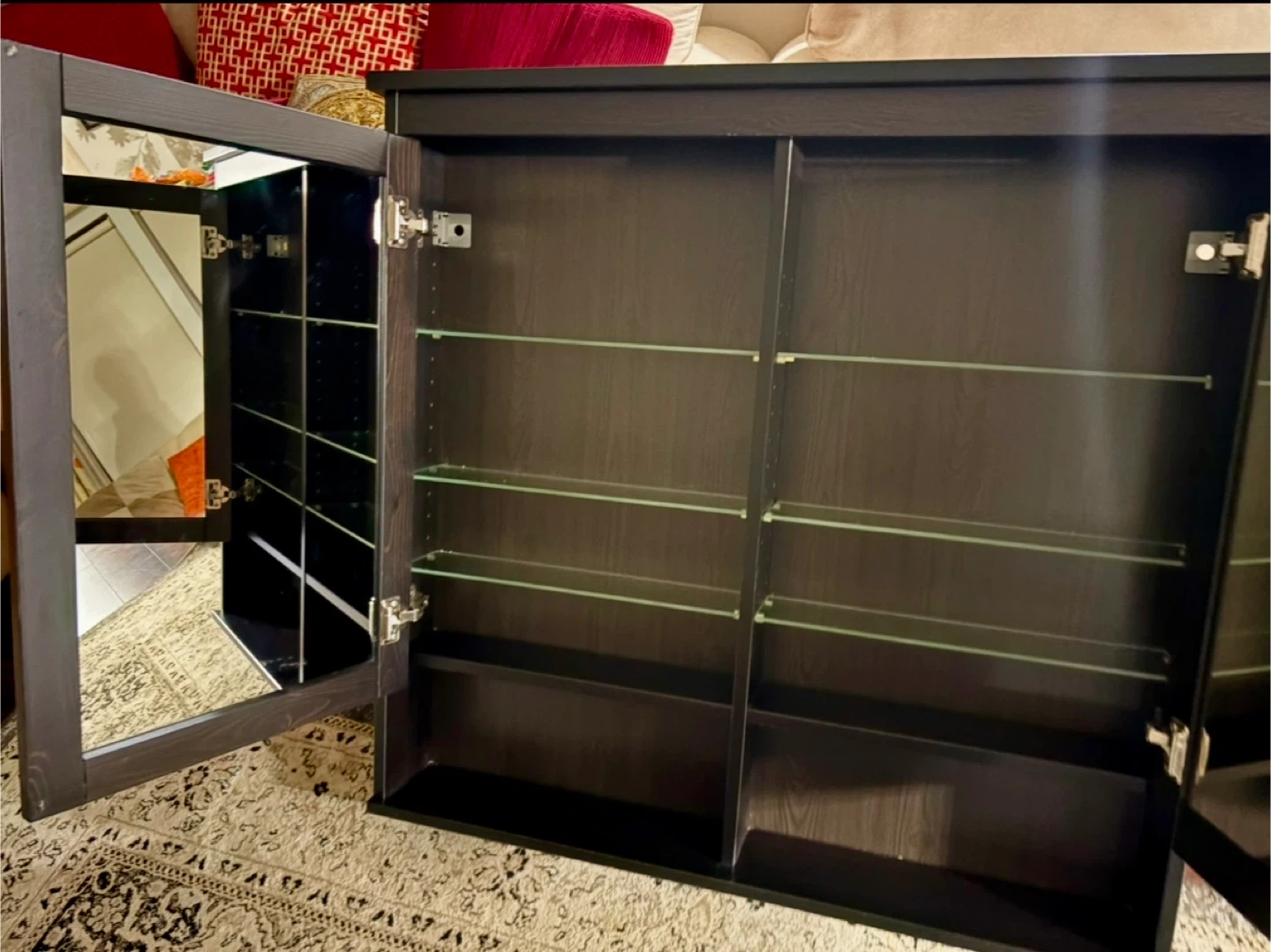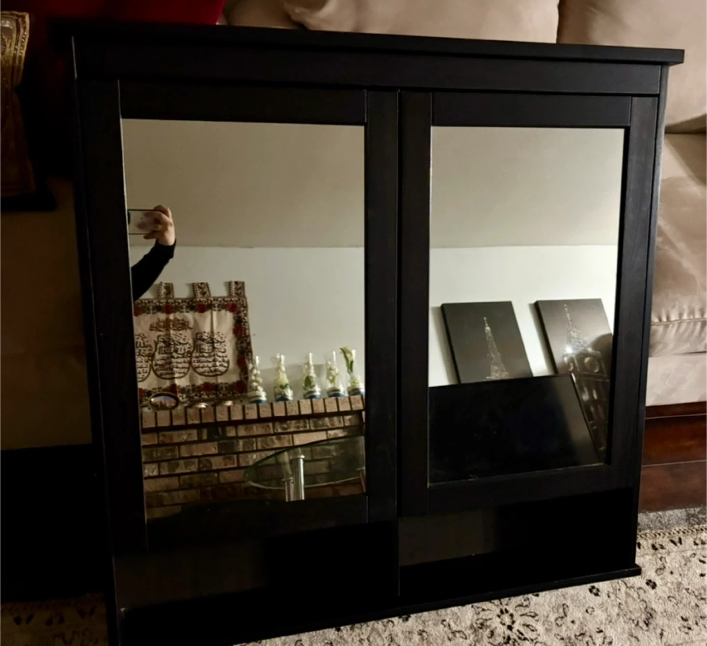 Beautiful modern wall-mounted cabinet with double mirrored doors. • Solid wood frame in sleek black finish • Adjustable tempered glass shelves inside (lots of storage space) • Can be wall-hung or used as a standing cabinet • Perfect for bathroom, hallway, or living room storage • Excellent condition, like new L= 38in W=40.5in D=5.5in