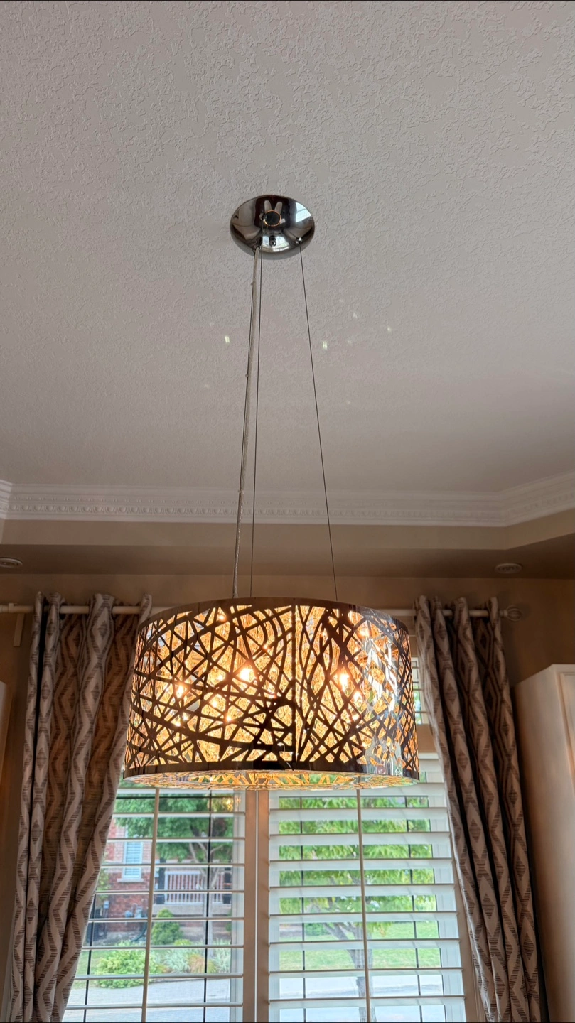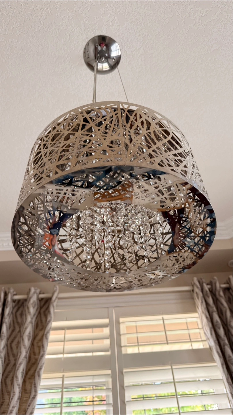Add a touch of modern elegance to your home with this drum chandelier! The intricate design and sparkling details will make it a focal point in any room. It is in great condition and ready to brighten up your space