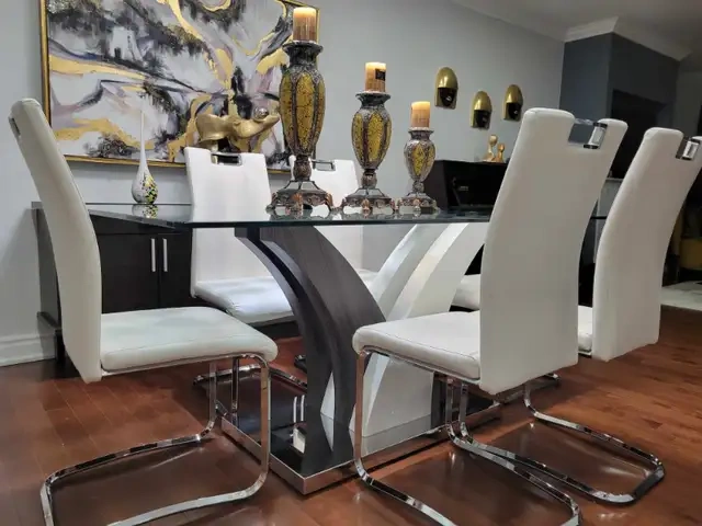 Selling a glass top dining table as seen in the pictures with 6 chairs for only $600. Selling because I want to get a 8 seat one. Can help you load it into truck. 71x40 inches A few of the chairs has some areas on the seat that have peeled. Similar one at Home Depot going for $2,300 + Tax: https://www.homedepot.ca/product/brassex-inc-napolean-7-piece-dining-set-white/1001798448