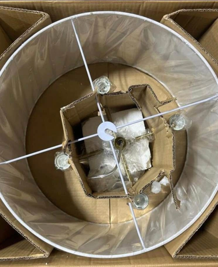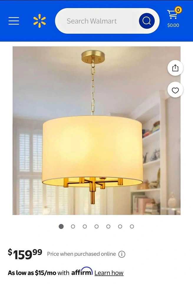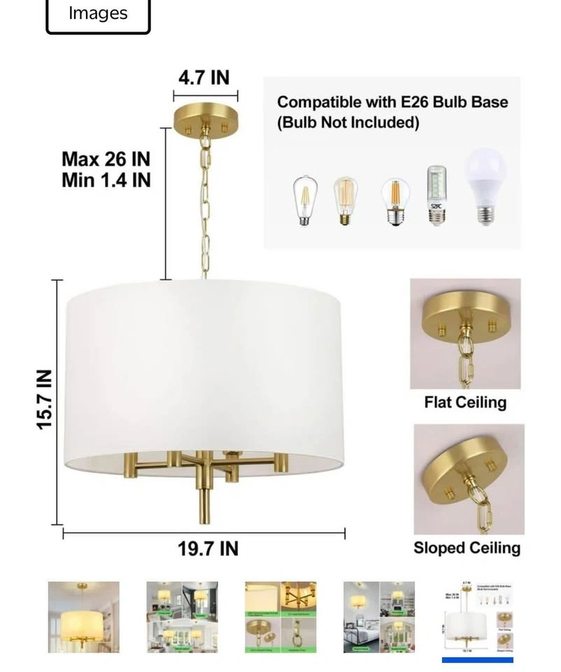 Brand new, never installed. Elegant gold finish with white fabric shade. Perfect for dining room, kitchen, or living space.