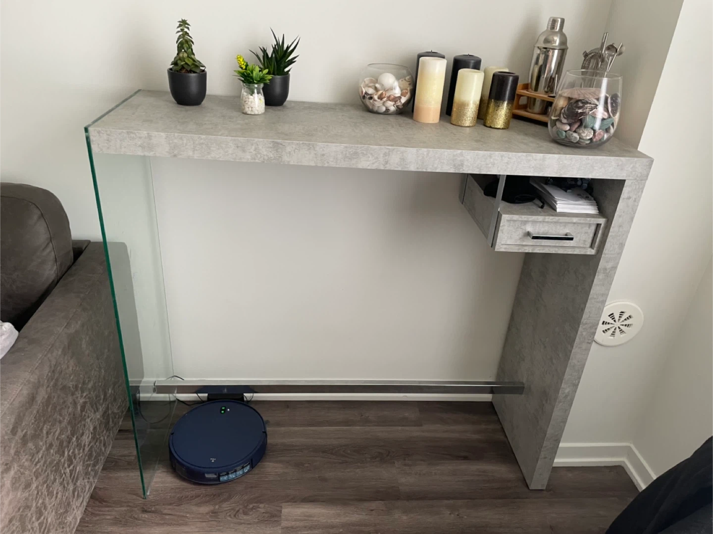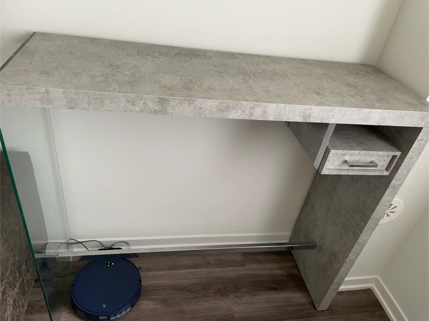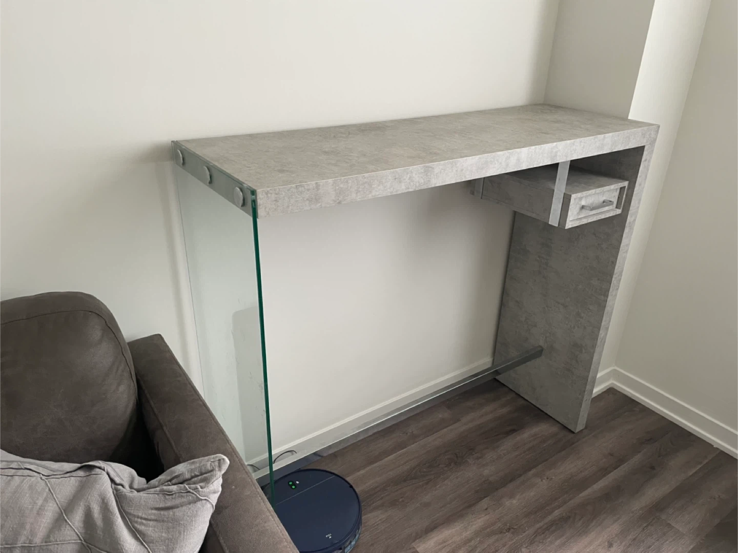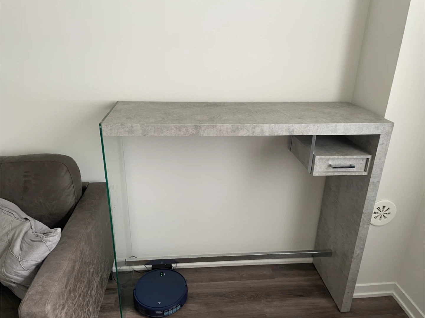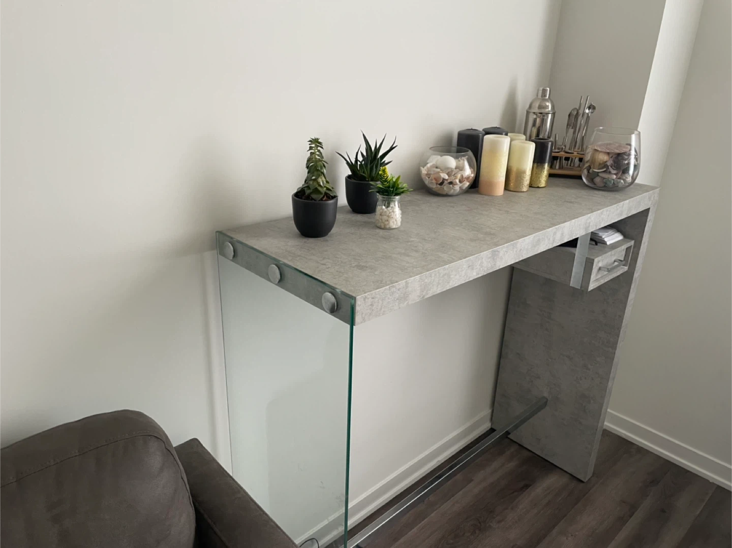 Looking to sell this stylish console table! It features a modern design with a concrete-like top and a sleek glass side panel. It also has a small drawer for storage. Perfect for an entryway or living room!