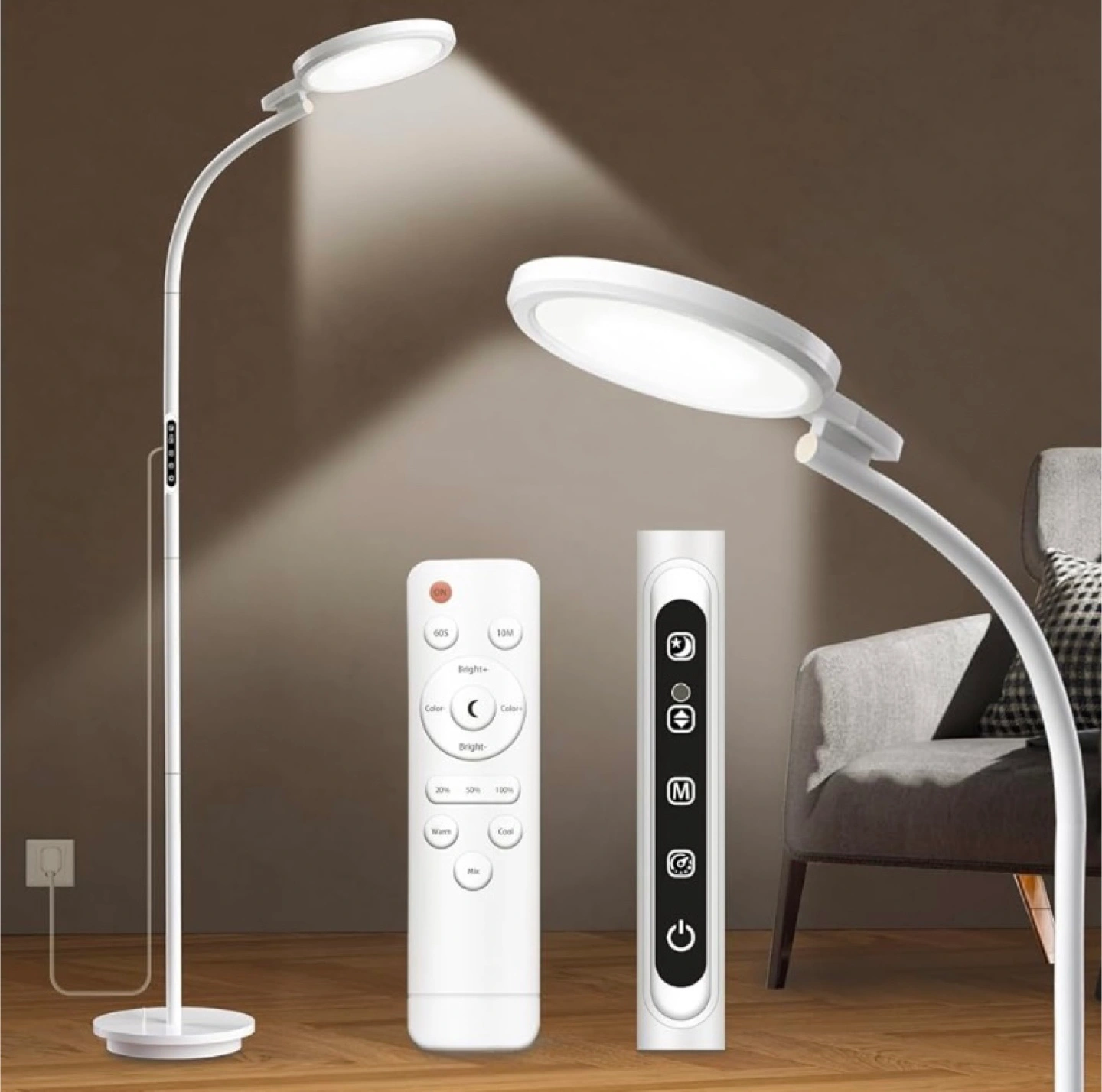 Adjustable floor lamp, features a circular LED light head. Remote control included for easy brightness and colour temperature adjustment. Sleek white design. Perfect for living rooms or bedrooms.