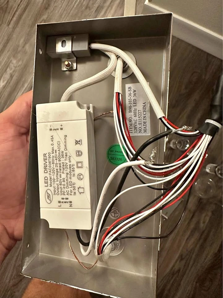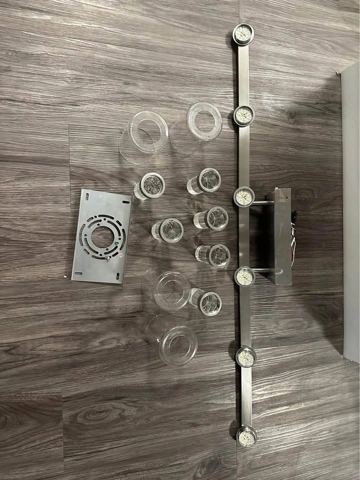 Modern LED Vanity / Wall Light – 6 Spot Heads with Glass Shades Stylish modern LED wall/ceiling light fixture with 6 LED spot heads. Includes glass cylinder shades for each head. Built-in 36W LED driver (AC 120V) – energy efficient and long-lasting. Sleek brushed metal finish, perfect for bathroom, hallway, or modern interior. Easy installation with mounting plate included. Condition: Used, good working condition. Provides bright, even light, perfect for daily use.