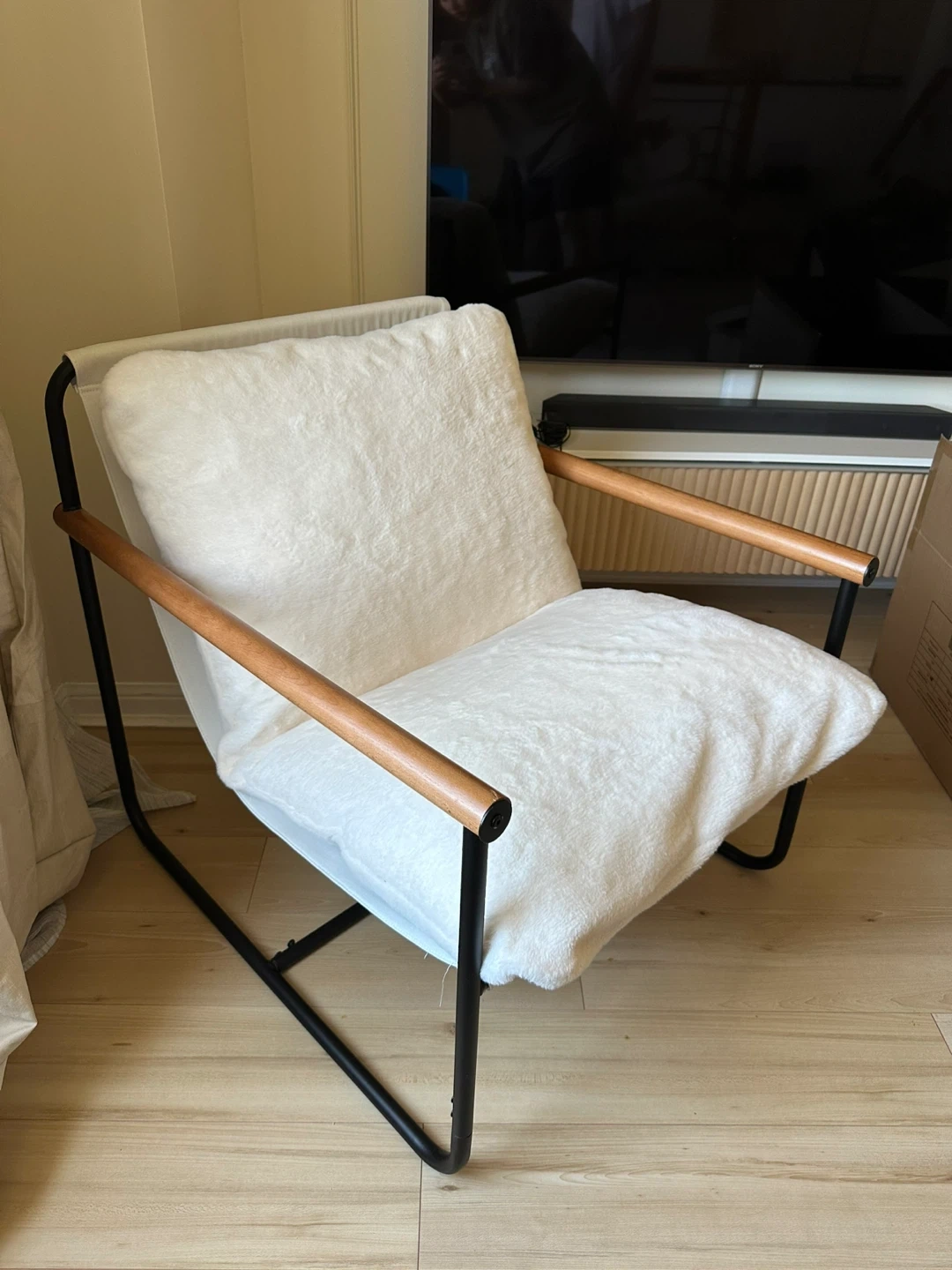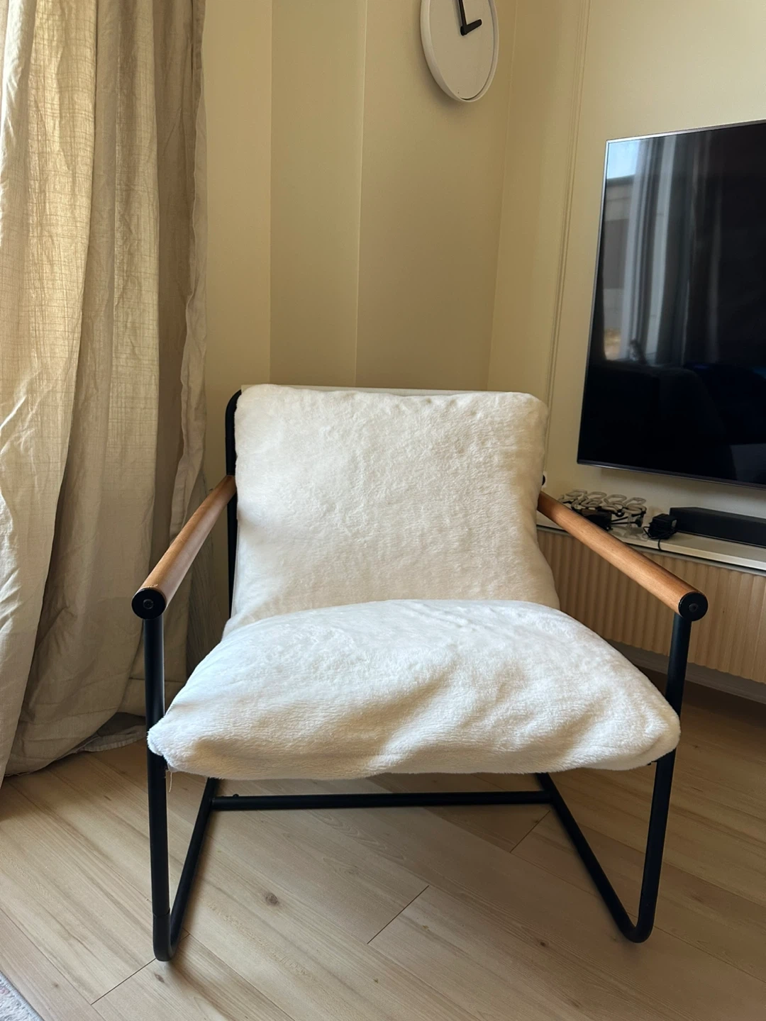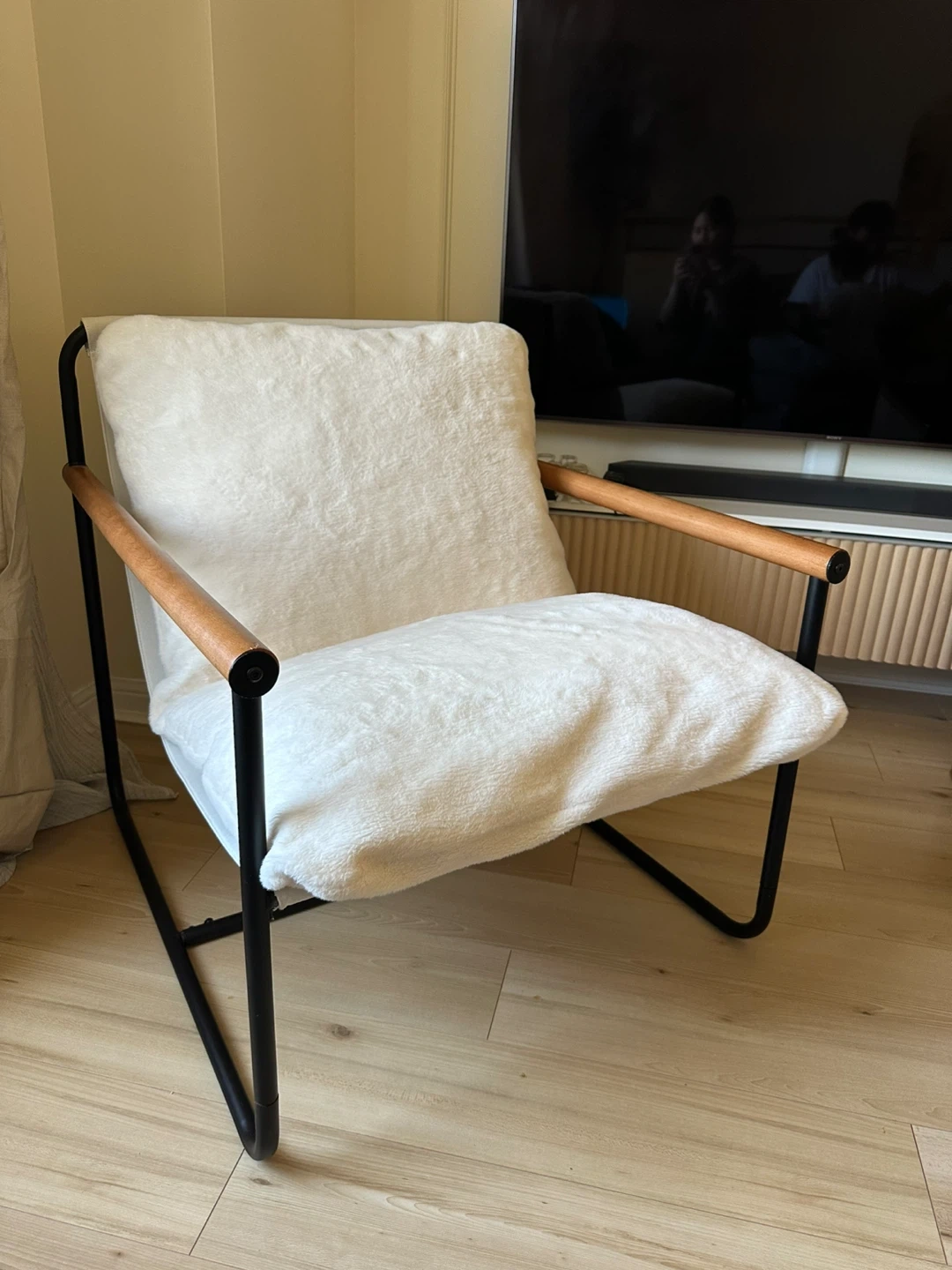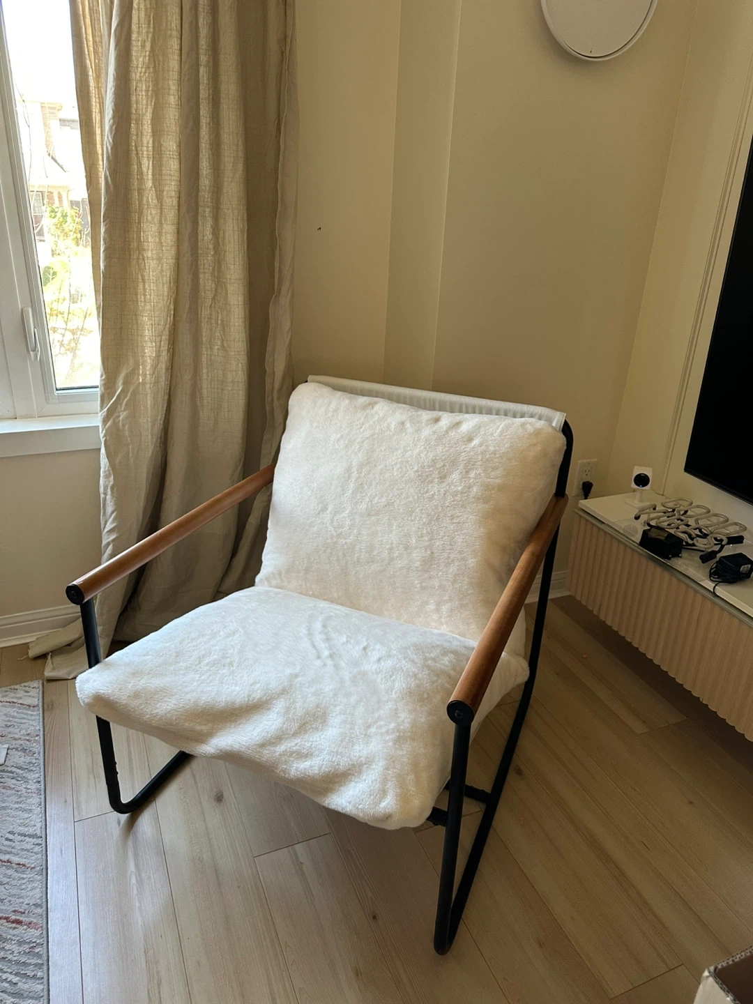 Selling a comfy lounge chair! It features a white coloured cushion and a sleek black metal frame with wooden armrests. It's in great condition and would look great in any living room or bedroom. Screws are a little loose just needs tightening. 30” height x 28 in width