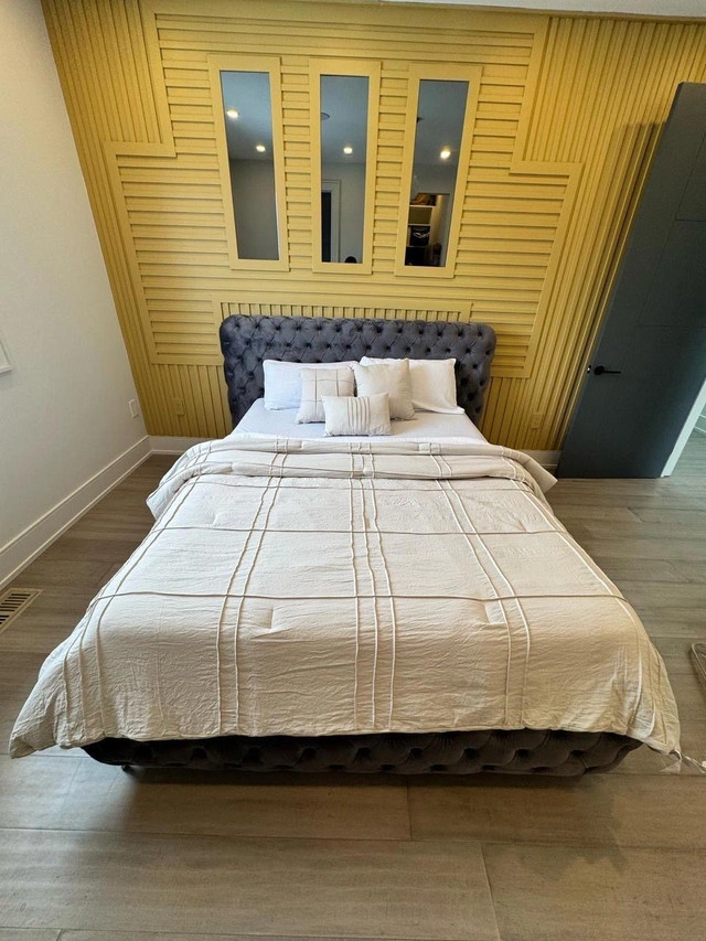 Modern Queen Bed – $500 (On Sale!) Upgrade your bedroom with this elegant, queen-size bed! Featuring a deep navy blue velvet headboard with classic button tufting and a low-profile modern frame, this bed makes a bold statement in any space. – fits standard queen mattress Mattress not included. Message me for further information For Sale By: Owner