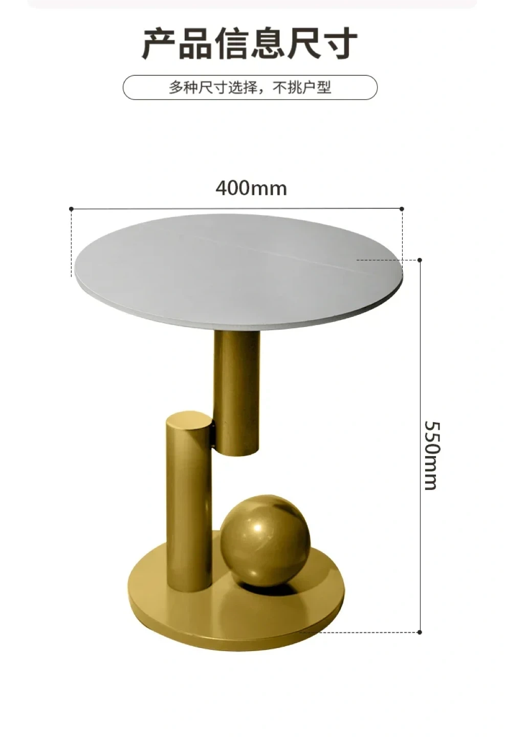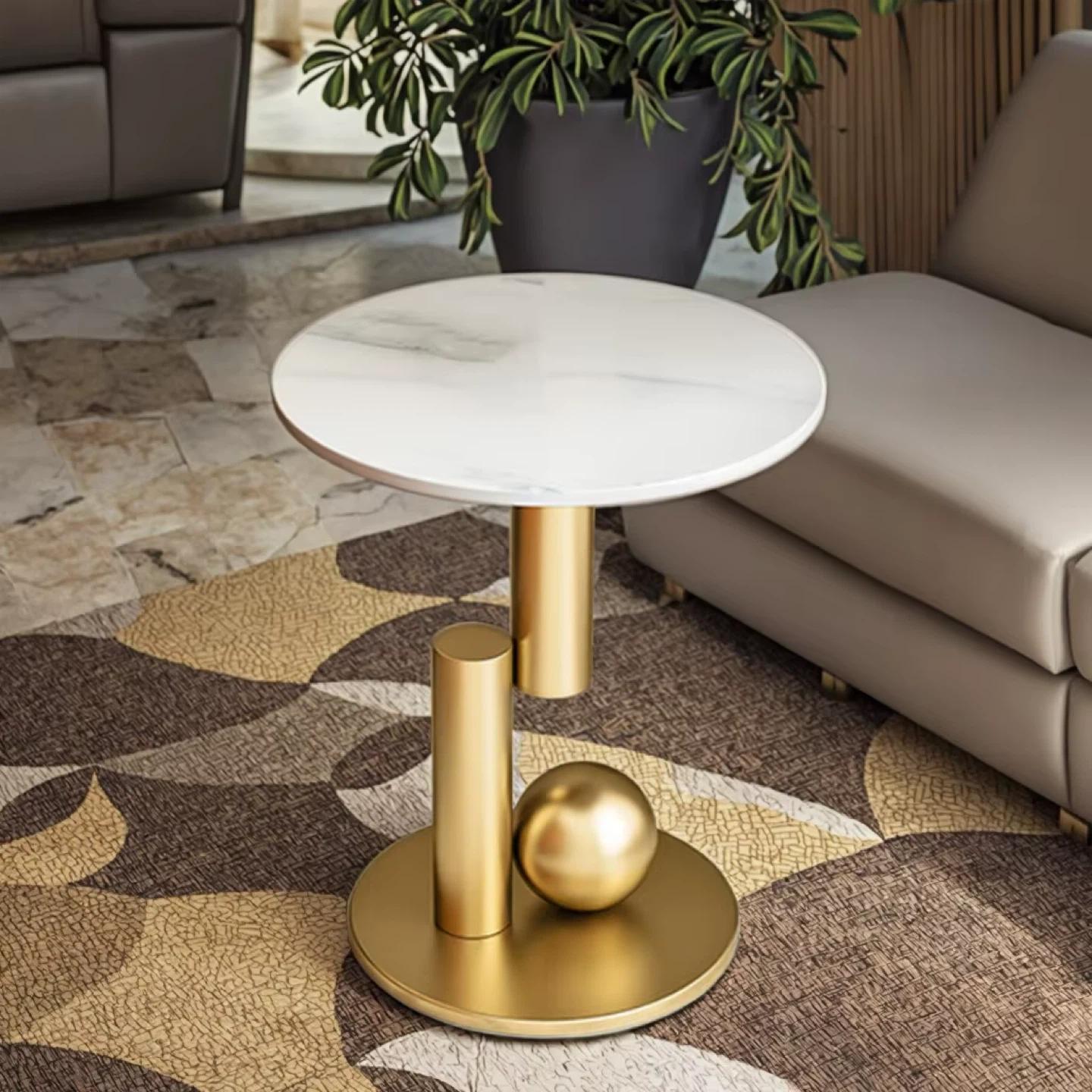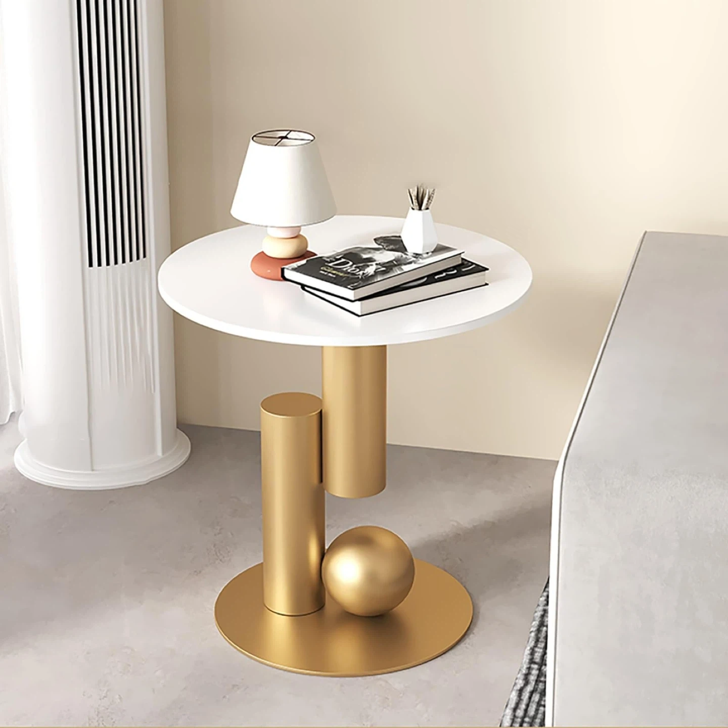 Looking to add a touch of modern elegance to your living space? I'm selling this stylish round side table with a gold and white finish. It features a unique design with cylindrical supports and a decorative sphere. The table stands at 550mm tall with a 400mm diameter top. Perfect for displaying decor or enjoying a cup of coffee!