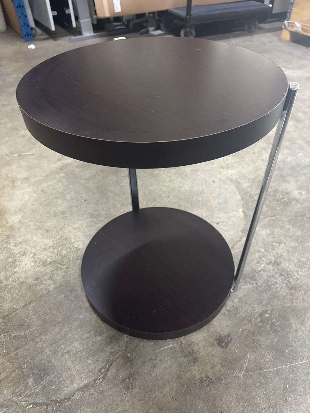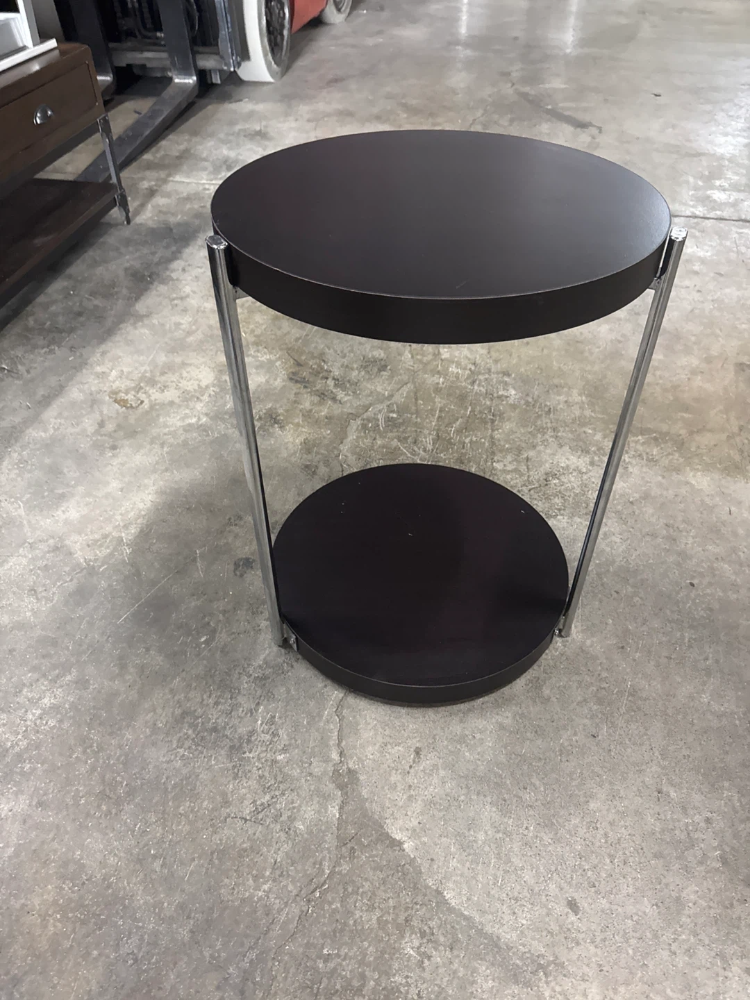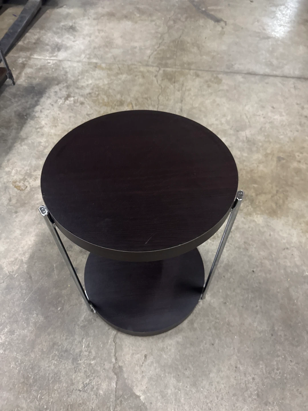 Sleek and functional round side table in a dark espresso wood finish with chrome accents. Perfect as an end table, nightstand, or accent piece in living rooms, bedrooms, or offices. ✨ Features: • Stylish round design • Rich espresso finish • Chrome-finish frame supports • Two-tier design for extra storage or décor • Sturdy and modern look 📏 Approx. 18” diameter x 22” height 📍 Located in Mississauga – pick-up only 💸 $45 CAD (firm deal – compares to $120+ retail)