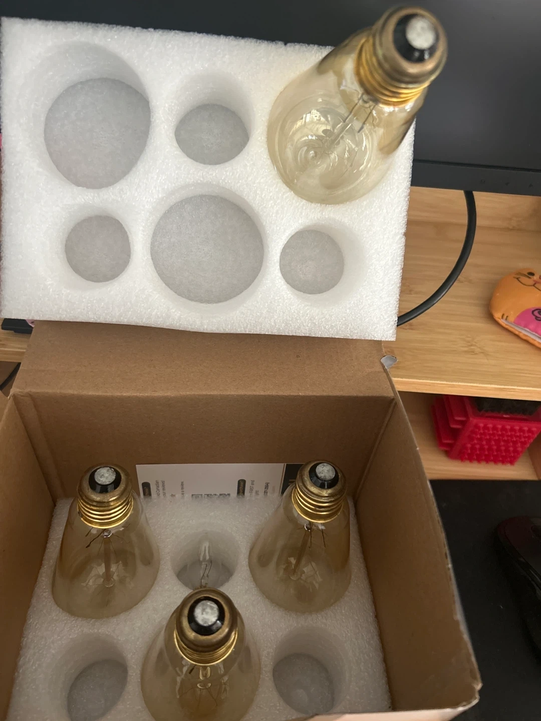 Brass/golden modern table lamp (works perfectly, on/off switch on cord) Comes with 5 Edison bulbs: • 4 brand-new, unused bulbs (https://www.amazon.ca/dp/B08RMNWDGF) • 1 lightly used bulb (currently in the lamp, works perfectly) Bulbs are warm amber (~2300K), dimmable, E26 base, high CRI (95+) for natural colors Great for creating a cozy, vintage-inspired atmosphere in your living room, bedroom, or desk 📦 Sold together as a set (lamp + bulbs) Pickup in Vancouver only