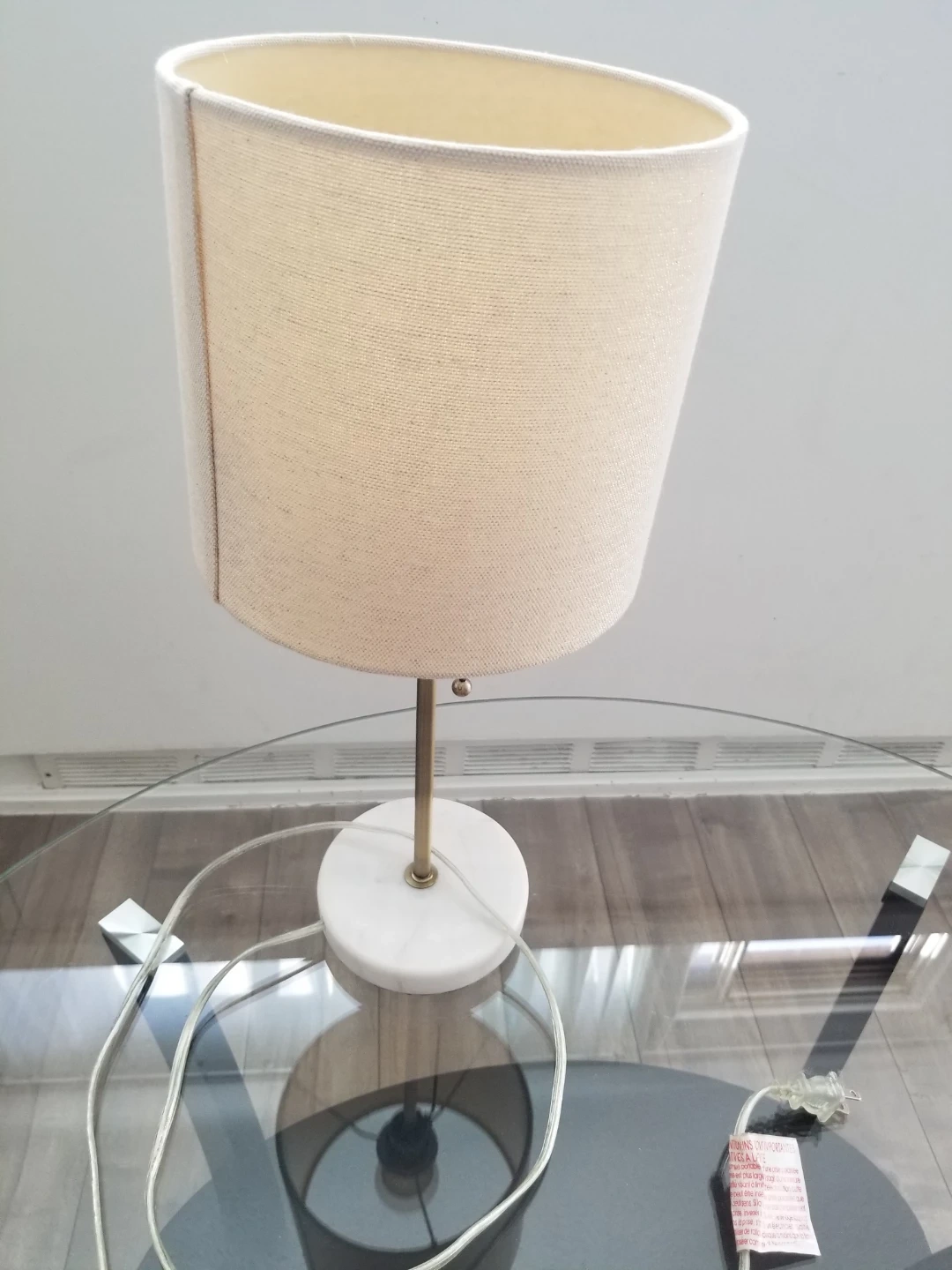 Stylish table lamp. Features a marble base and a brass-coloured stem. Beige fabric shade included. Simple design, perfect for bedside table or desk.