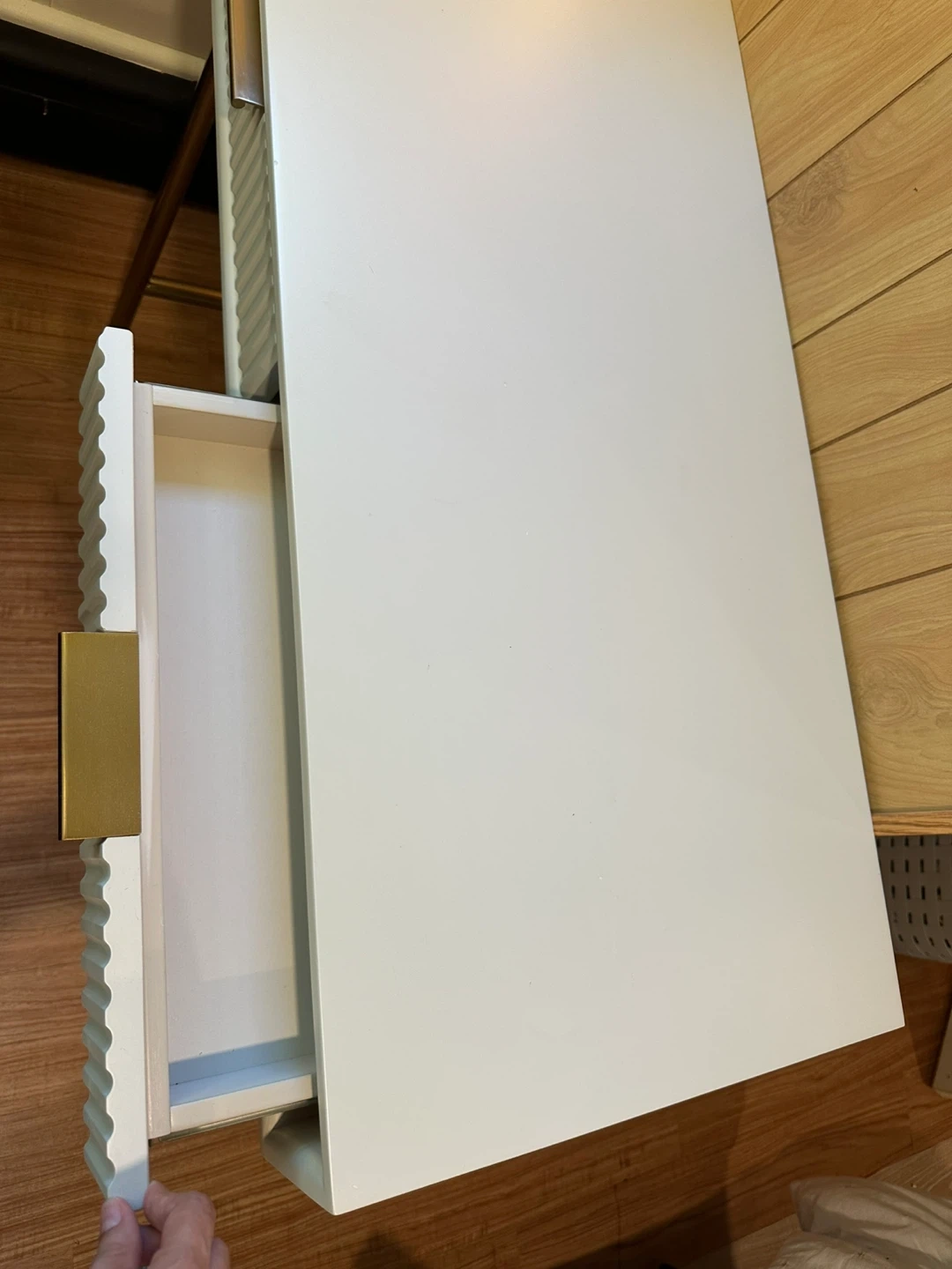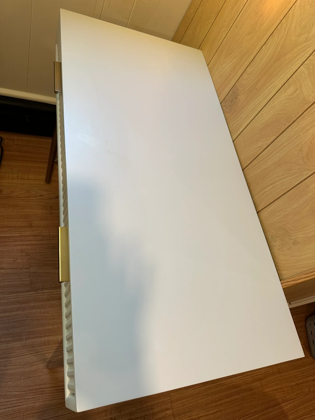 Selling a vanity table in excellent condition, perfect for makeup or as a stylish accent piece. ✔️ Comes with a comfy upholstered stool in terracotta color. ✔️ Modern design with gold metal legs and a textured drawer front. ✔️ Ideal for bedroom, beauty room, or personal space. 📏 Dimensions: 95 cm wide x 70 cm high. 💲 Price: $150 📍 Pickup in Scarborough .