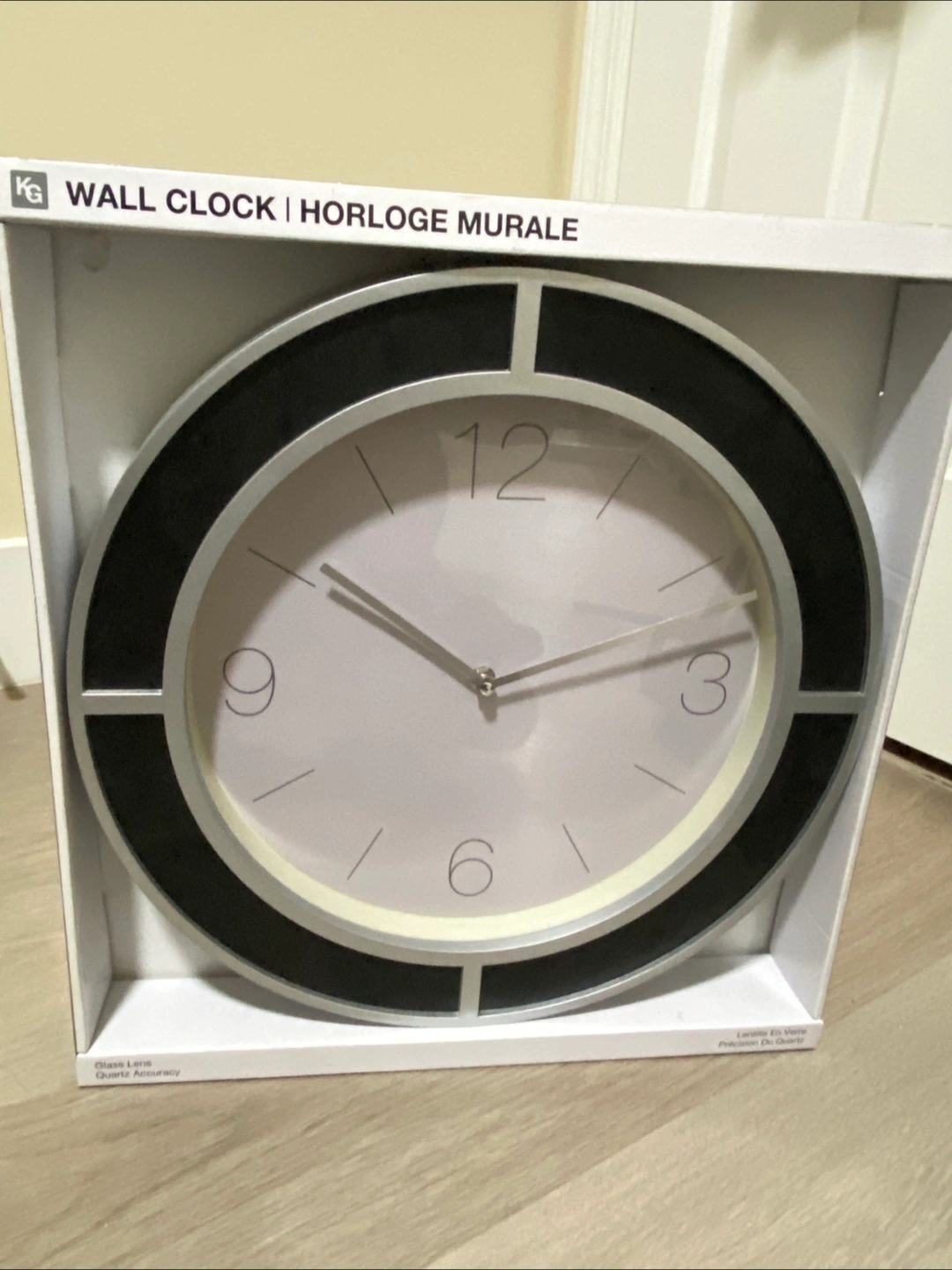 Add a touch of elegance to your space with this brand new KG Wall Clock. Whether itβs for your home, office, or a gift, this clock brings both functionality and modern style to any wall. π€ Design Highlights: βοΈ Clean, minimalist look with bold black & silver accents βοΈ Easy-to-read numbers and smooth, silent movement βοΈ Glass lens with quartz accuracy for reliable timekeeping βοΈ Lightweight yet sturdy β ready to hang! π Approx. Size: 12β diameter π Battery operated (requires 1 AA β not included) π¦ Still in box β never used! Pickup only but can deliver to the nearest train station