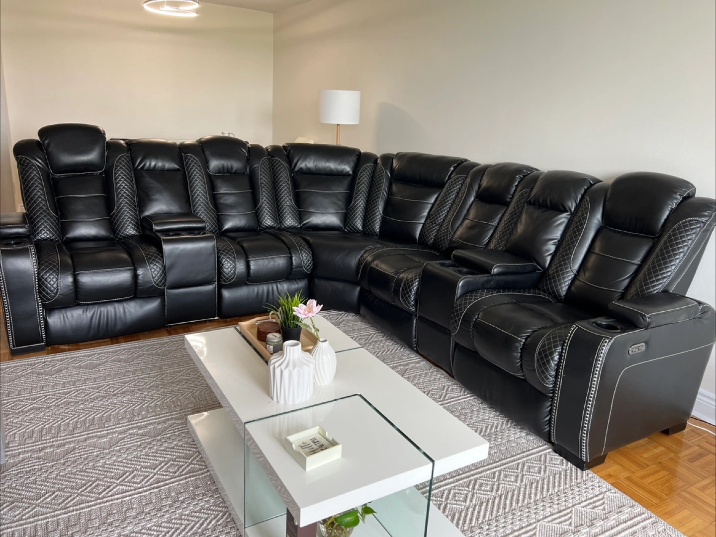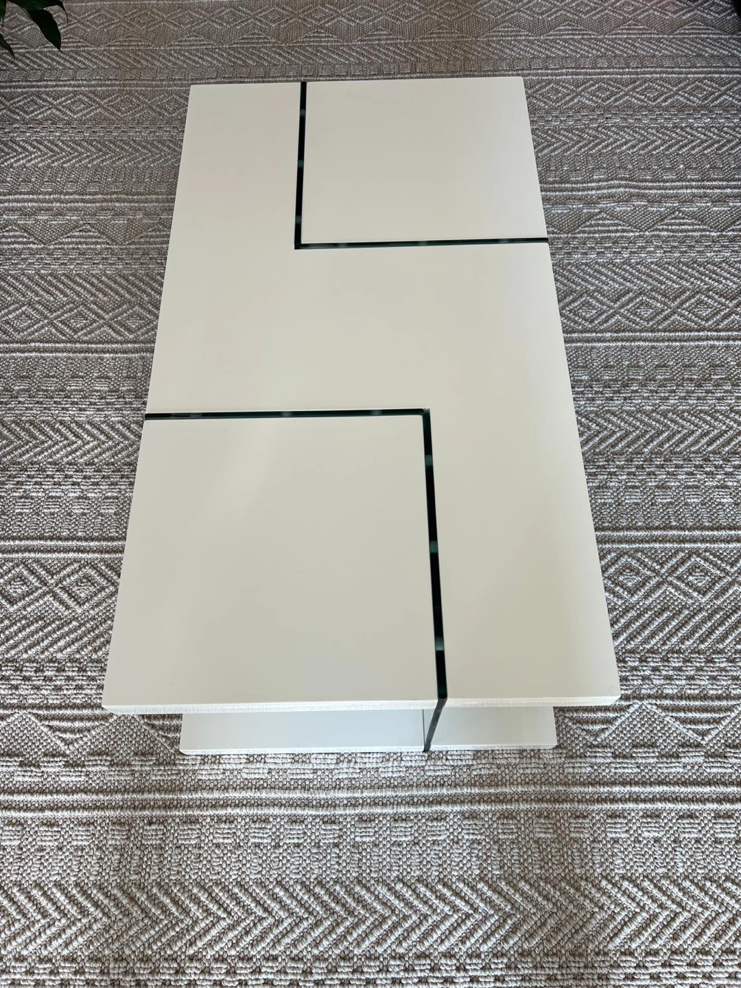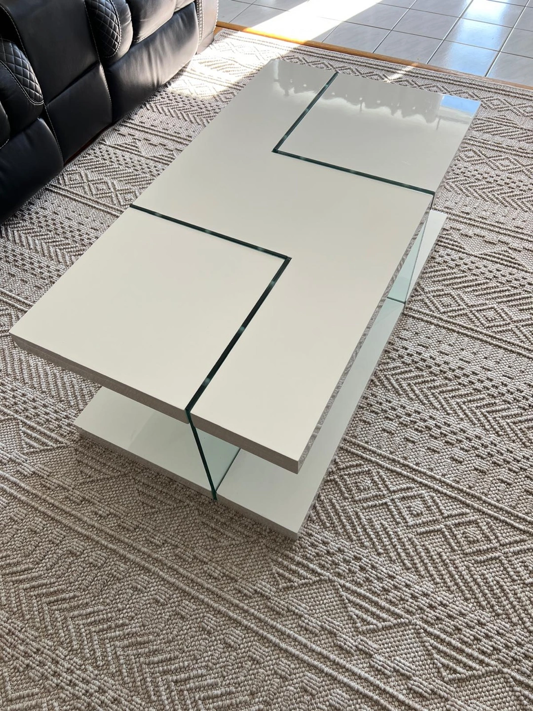 Selling a modern coffee table with a sleek white finish and glass accents. It's in great shape and would look fantastic in any living room. The unique design adds a touch of elegance and sophistication to your space. If you're looking for a stylish and functional coffee table, this is it!