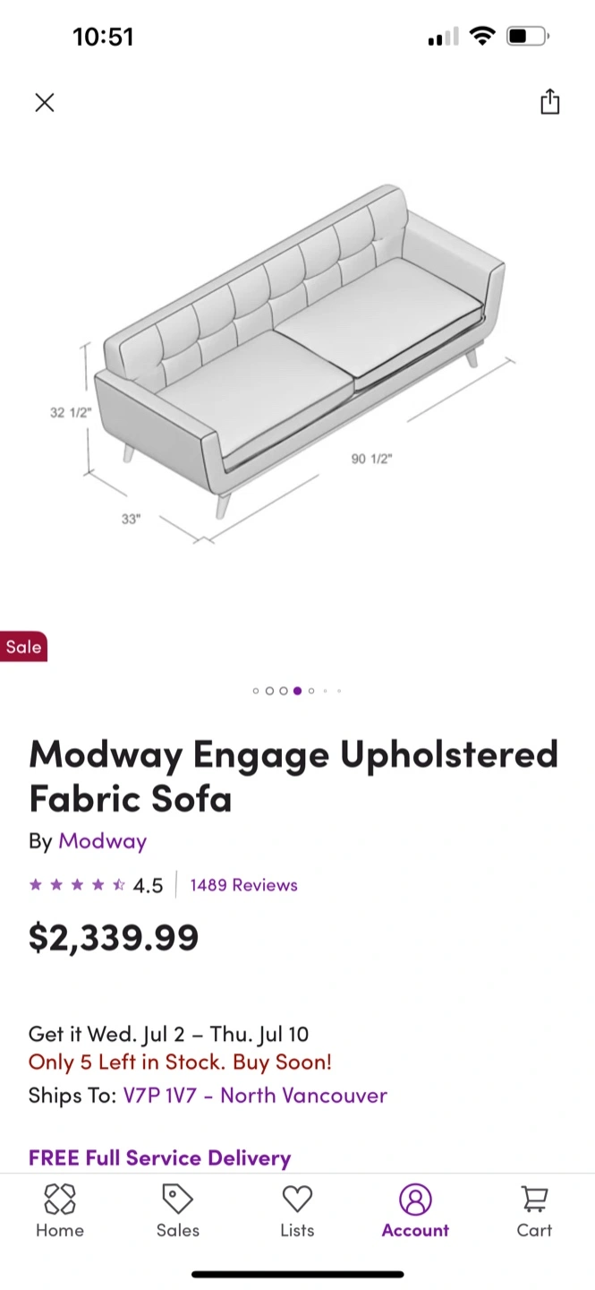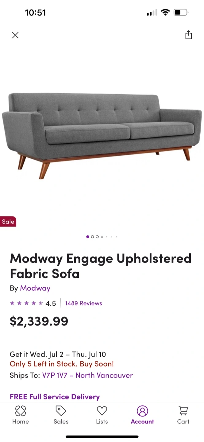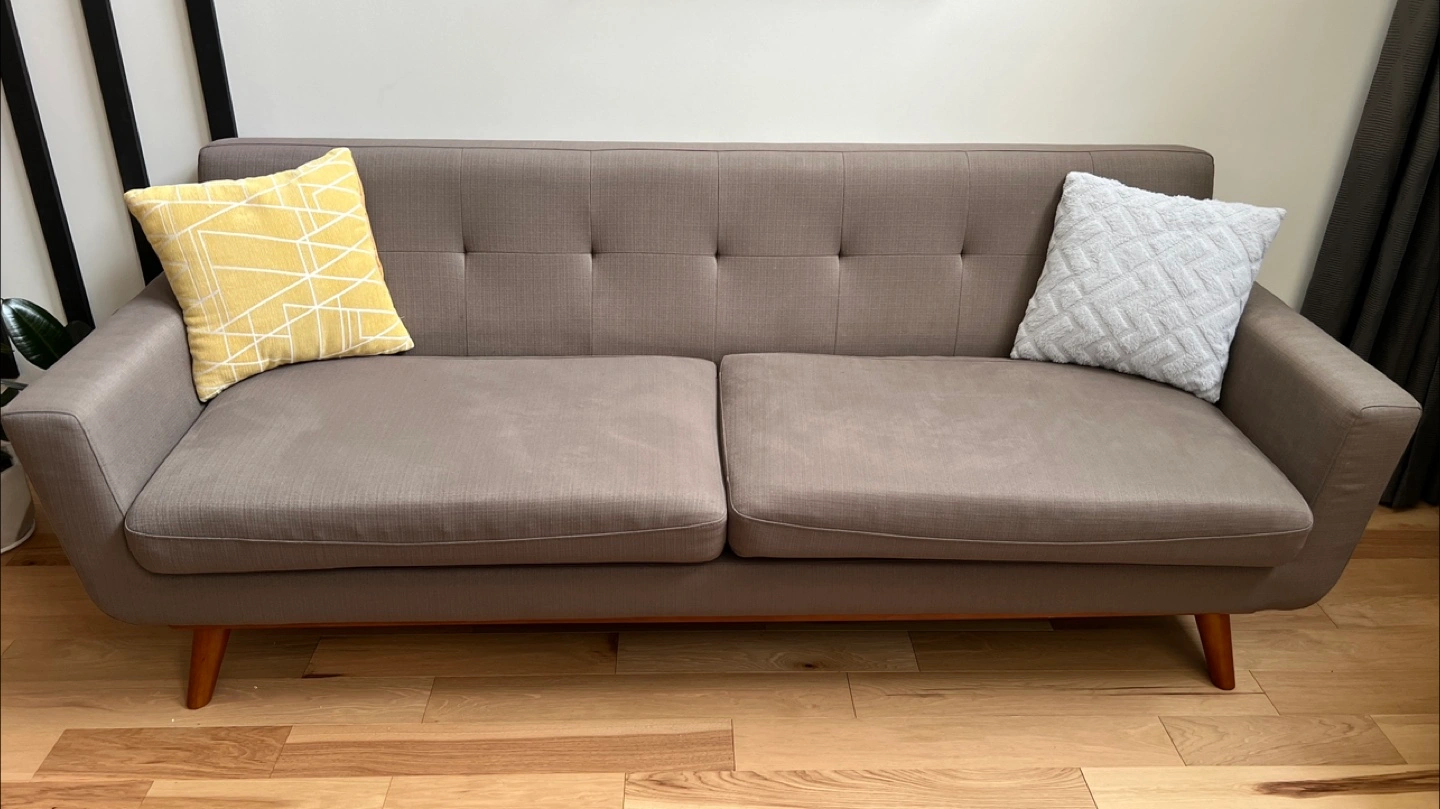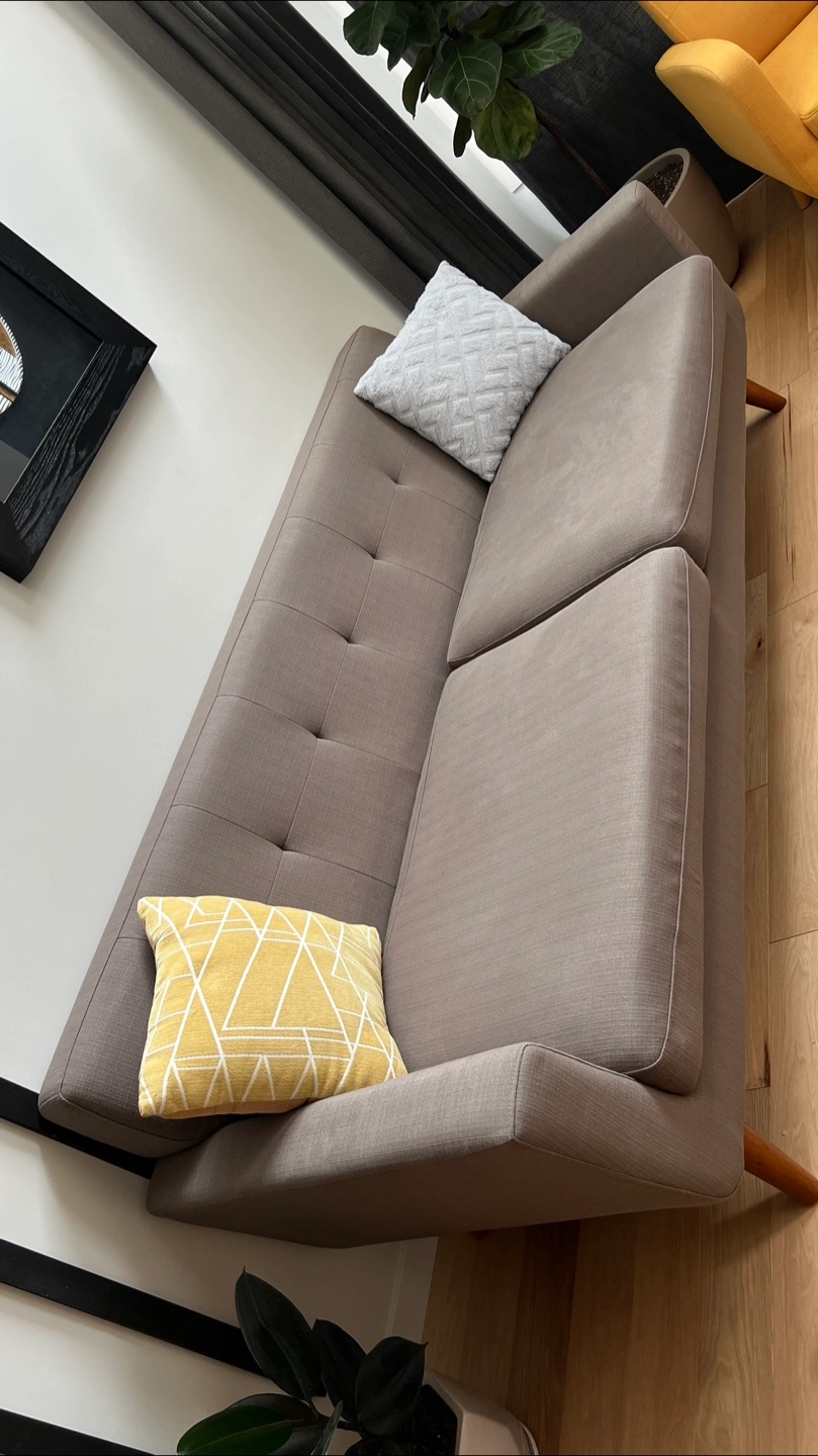 Beautiful fabric sofa with angled legs. The sofa with button tufting on the back, perfect for your living room. A comfortable spot to unwind after a long day.
