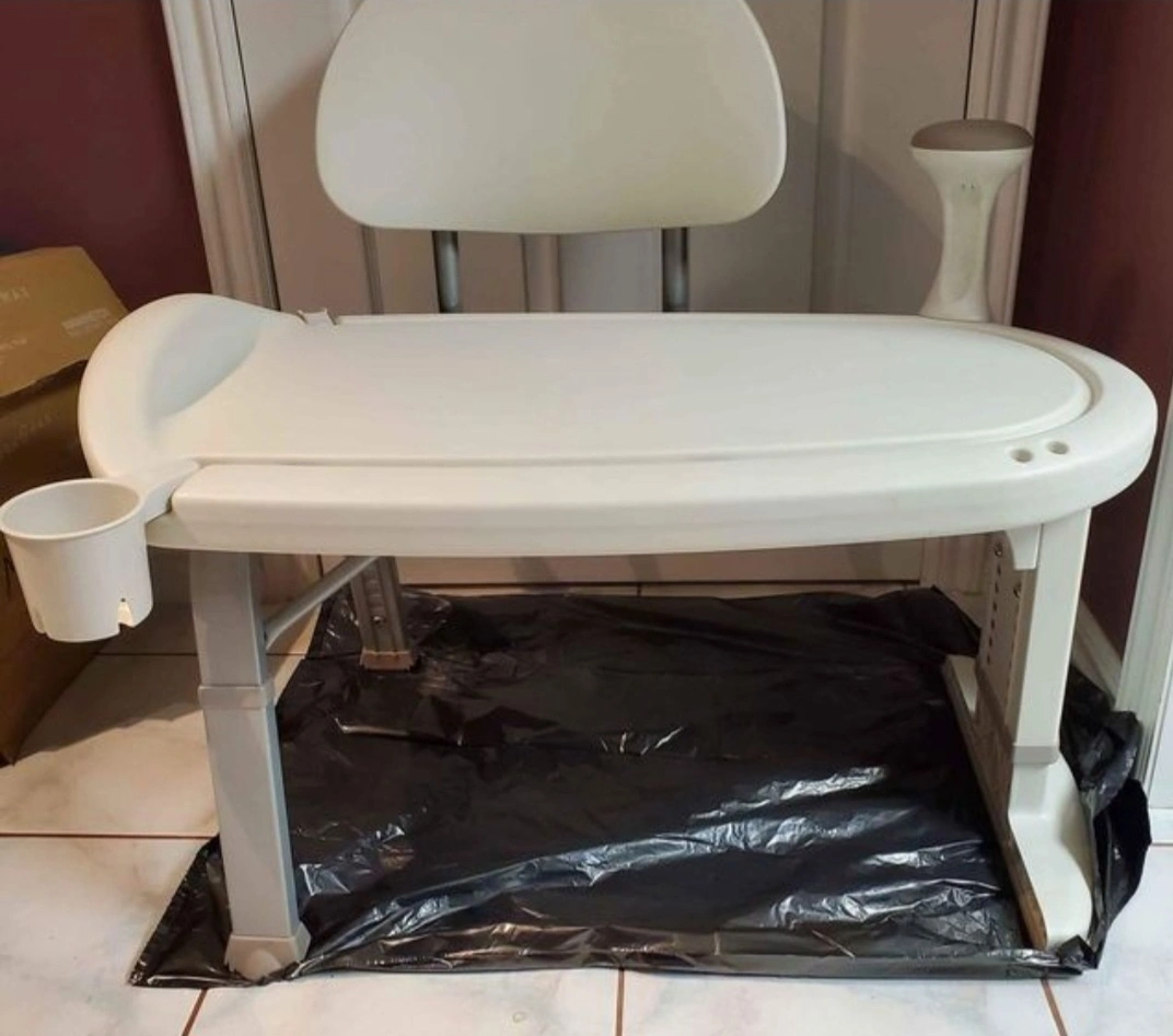 Moen Home Care Transfer Bench: - For easy access into bathtub without bending or fear of slipping - It sits over the side of the tub. Sit on the bench and lift legs over into tub - Allows you to sit and bathe - Non slip seat - Non slip feet - Reversible: Back & accessories can be transferred to opposite side - Adjustable Cup for holding toiletries - Attachment to hold shower head and hose - Close to $200 new unassembled - Very sturdy - Like new, from estate so no longer needed - Cleaned and ready to go - Will clear the tub to about 19"