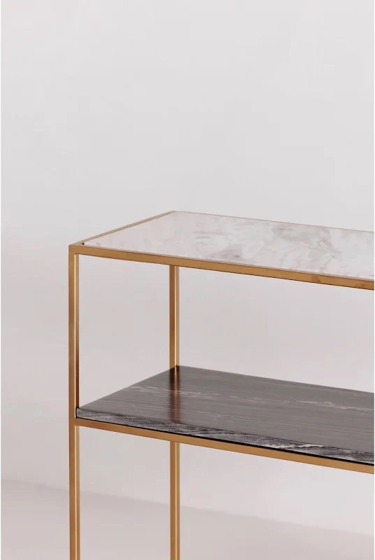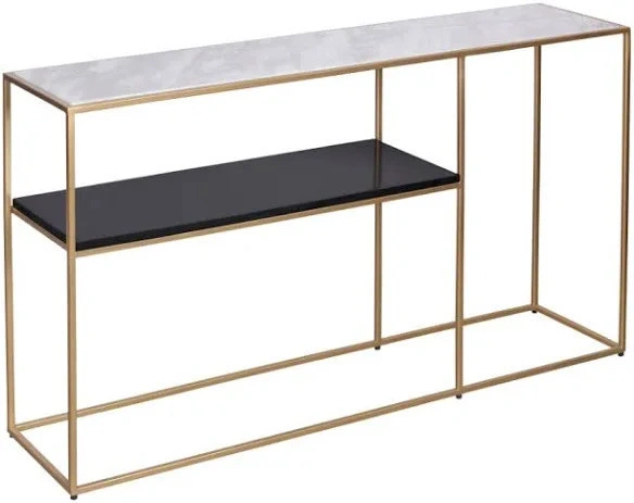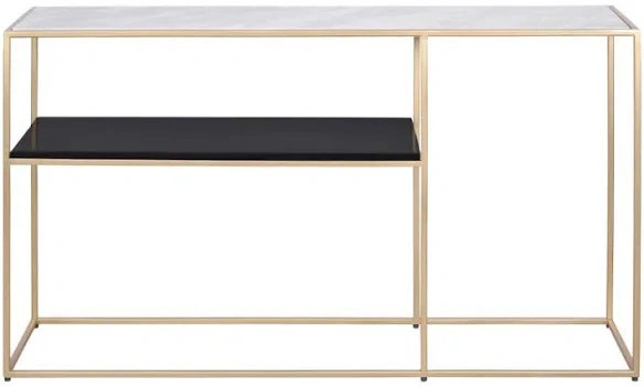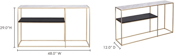 Add a touch of modern elegance to your living space with this Moes Home Collection Mies Console Table. This stylish used console table features a sleek design with a white marble-look top and a black shelf, complemented by a gold-tone metal frame. Perfect for entryways, living rooms, or hallways, it offers both display and storage space. There is some minor wear and tear. Features: - Brand: Moes Home Collection - Model: Mies Console Table - Colour: Gold tone frame, white marble-look top, black shelf - Dimensions: 48" W x 12" D x 29" H - Material: Metal, manufactured wood - Condition: Used - Good