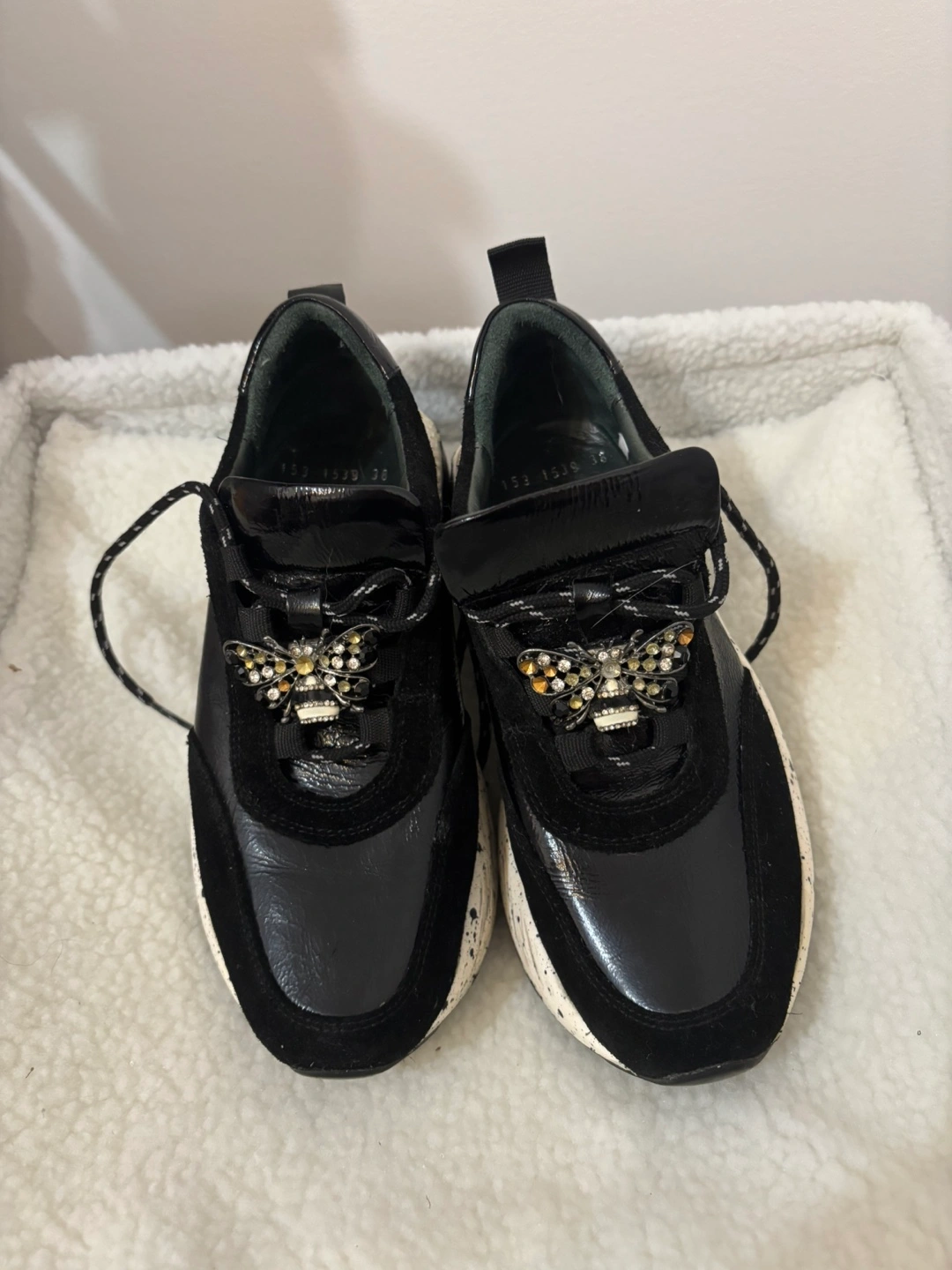 Selling a pair of Molly Bessa sneakers! They’re a size 8 and feature a unique bee embellishment. The shoes have a black patent leather and suede upper with a speckled white sole. They’re in great condition!
