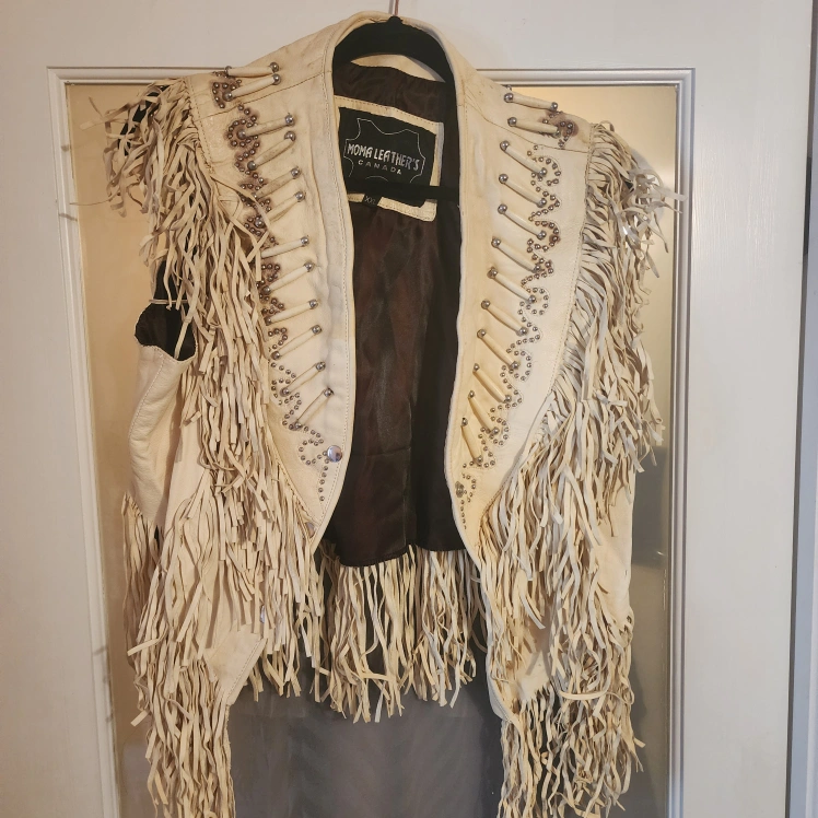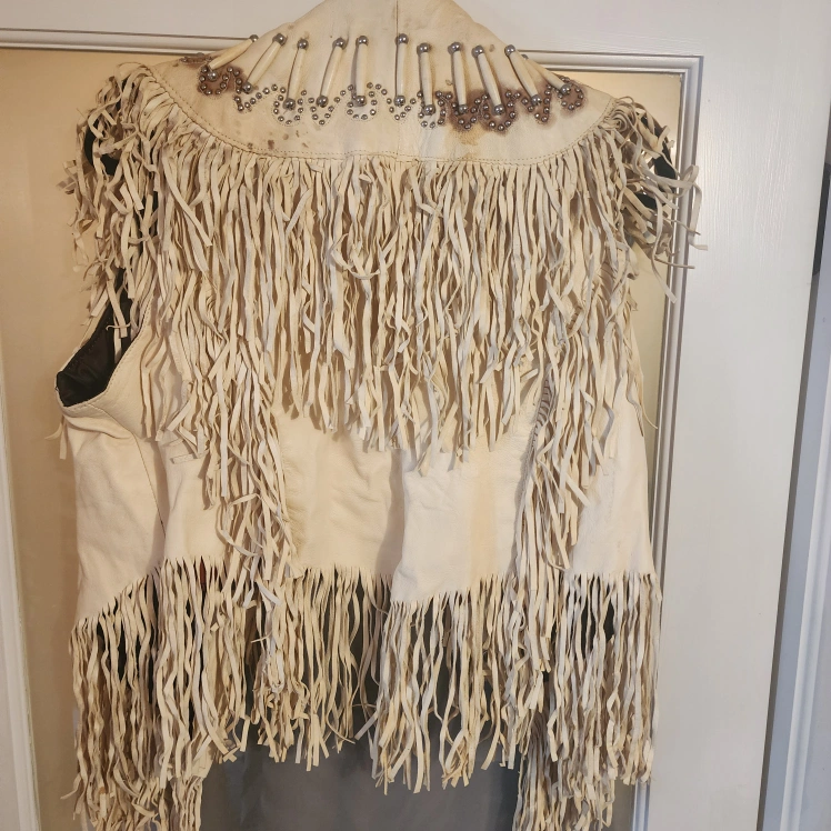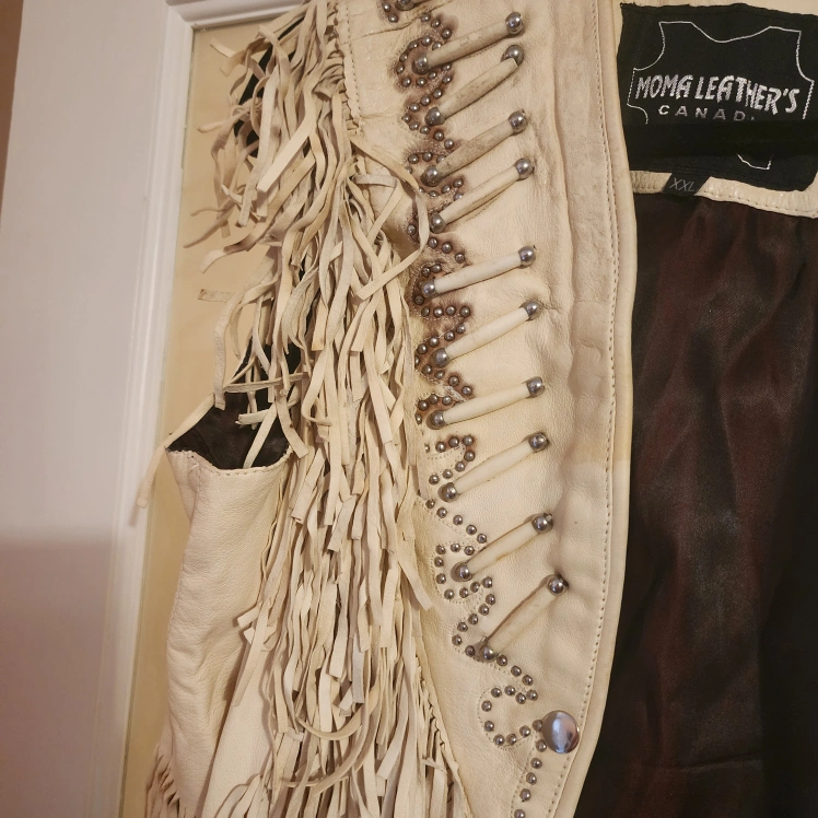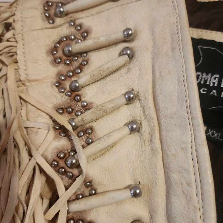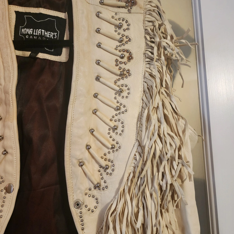 Selling a Vintage Lamb Moma Leather's vest with a unique fringe design! It's a size XXL and made in Canada. This vest is sure to add a statement to any outfit! Some staining around the metal studs as it is Vintage.