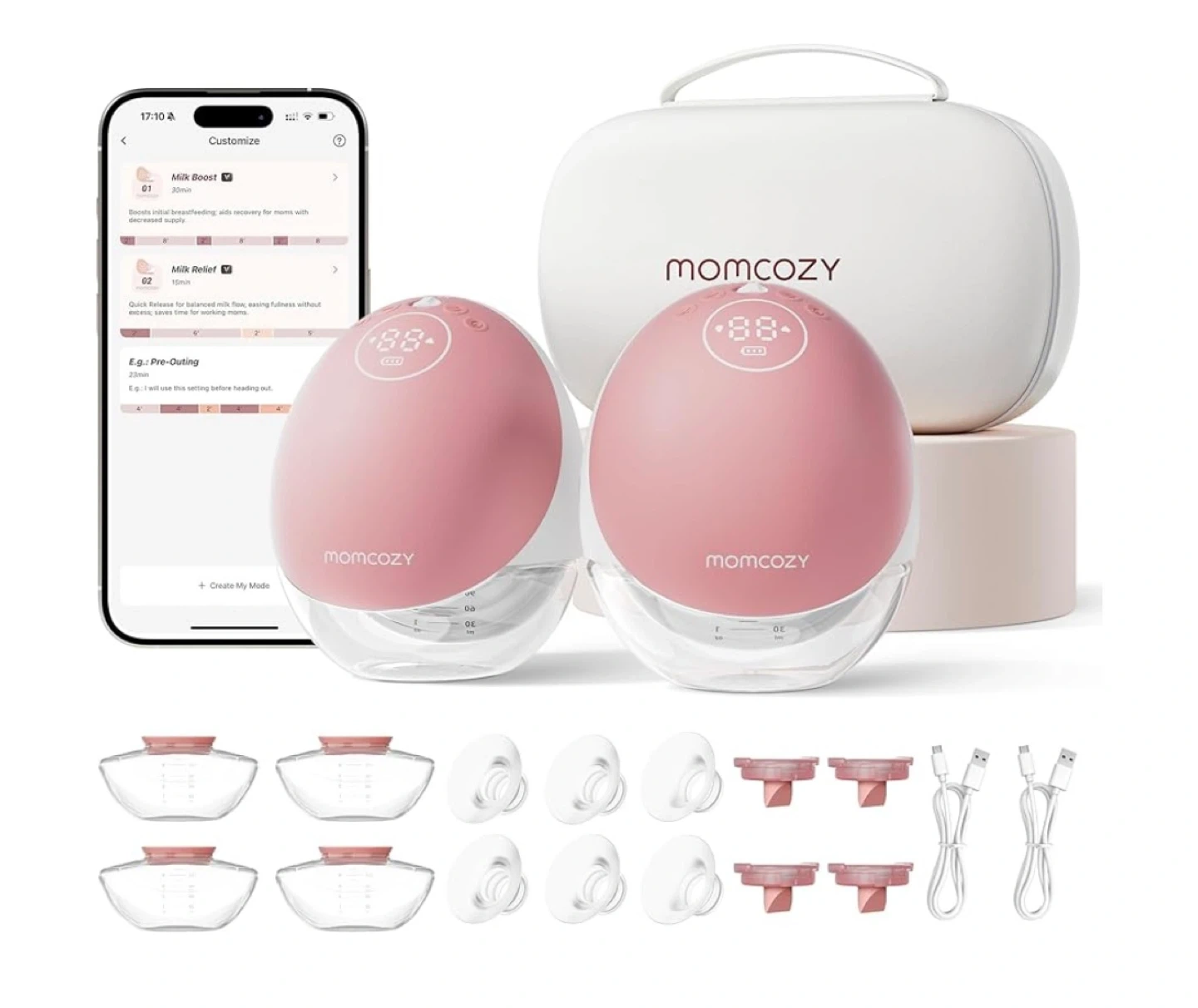 I'm selling a Momcozy breast pump with the DoubleFit Flange. It assembles in just 3 seconds! The tritan bowls are milk safe, so there's no hassle to wash or transfer immediately. It also has true quiet power of peak performance! It only takes 12 minutes to charge for a full session