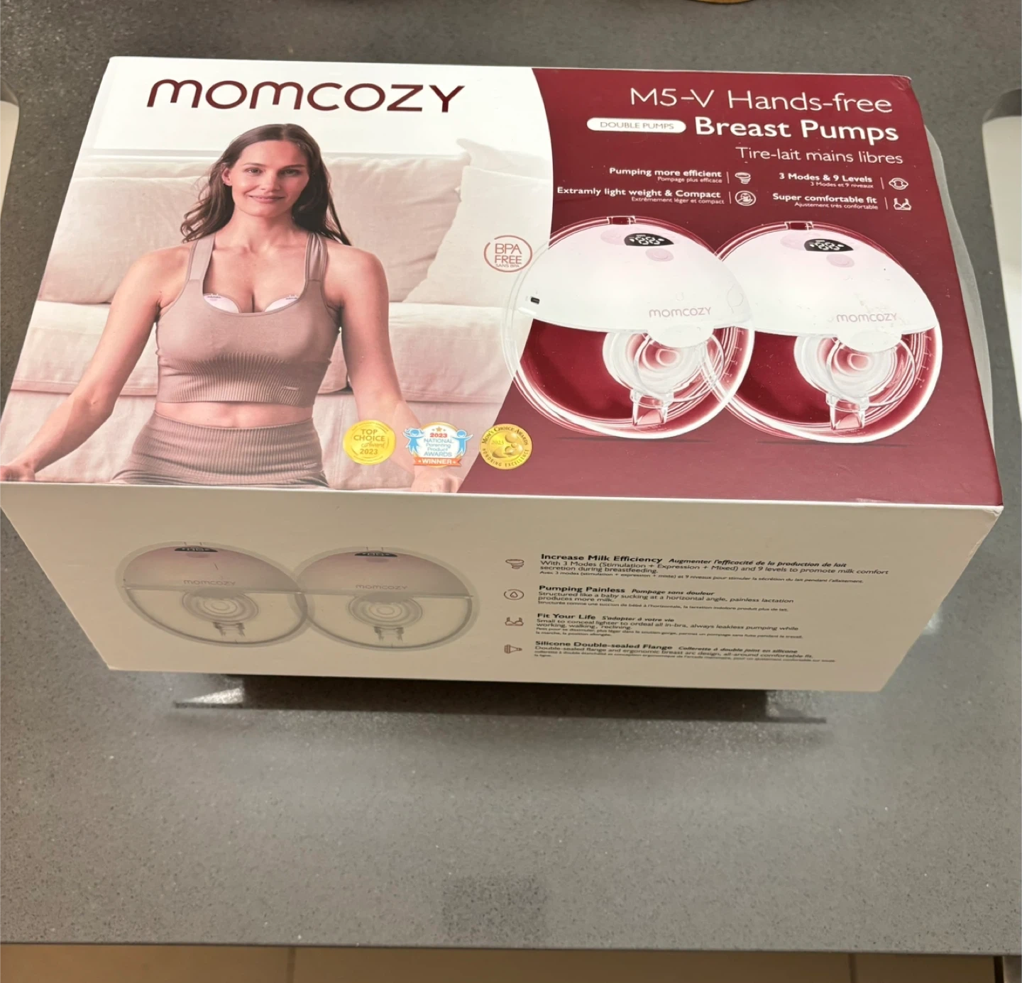 Selling a Momcozy M5-V hands-free double breast pump set! It's extremely lightweight and compact. This breast pump has 3 modes and 9 levels. It also has super comfortable fit. Increase milk efficiency, pumping painless. The flange is silicone double-sealed. 3 different sizes of flange original manual and accessories included Used only 3-4 times while travelling in past 6 months