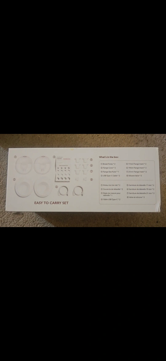 A new, easy to carry breast pump set. The box includes pump parts, USB cables, and other components for pumping. This set is a great way to provide comfort for the breastfeeding parent. used only a couple times but it works great