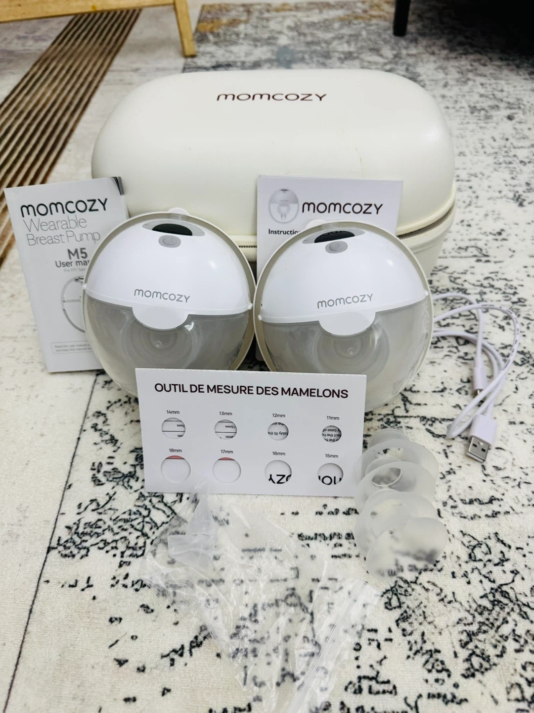 the product is clean Selling a Momcozy M5 Wearable Breast Pump. It comes with the user manual and a carrying case. Perfect for hands-free pumping!