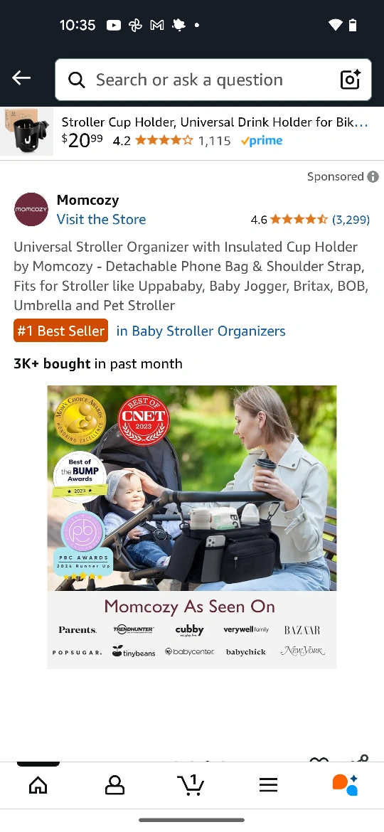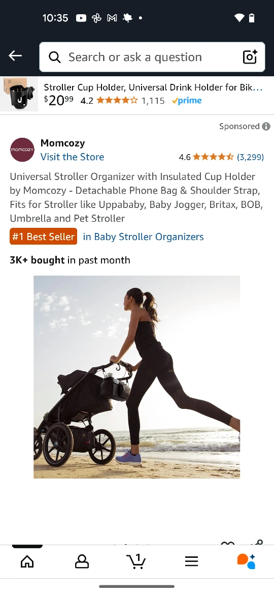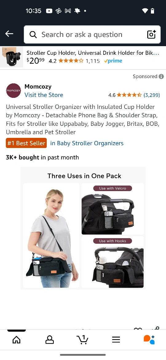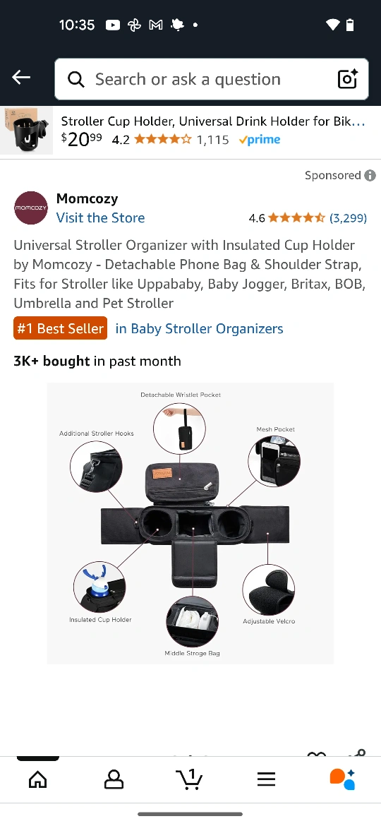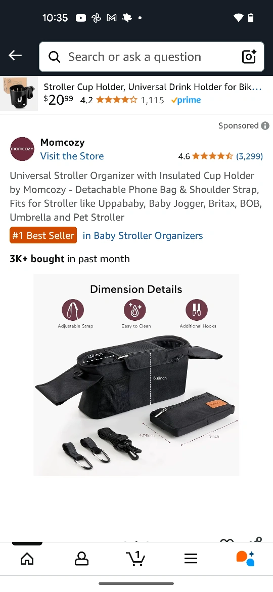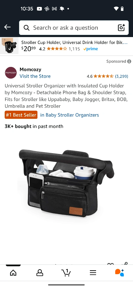 Check out this Momcozy universal stroller organizer! It comes with an insulated cup holder, a detachable phone bag, and a shoulder strap. It's designed to fit strollers like Uppababy, Baby Jogger, Britax, BOB, Umbrella and Pet Stroller. It's a #1 Best Seller in Baby Stroller Organizers!